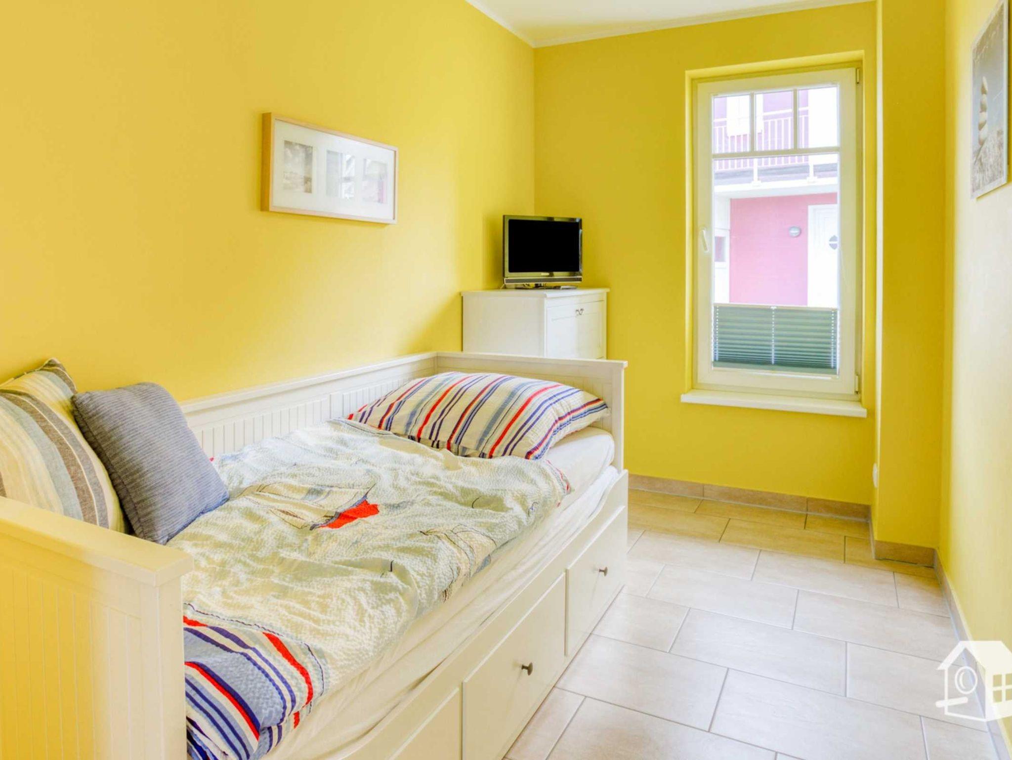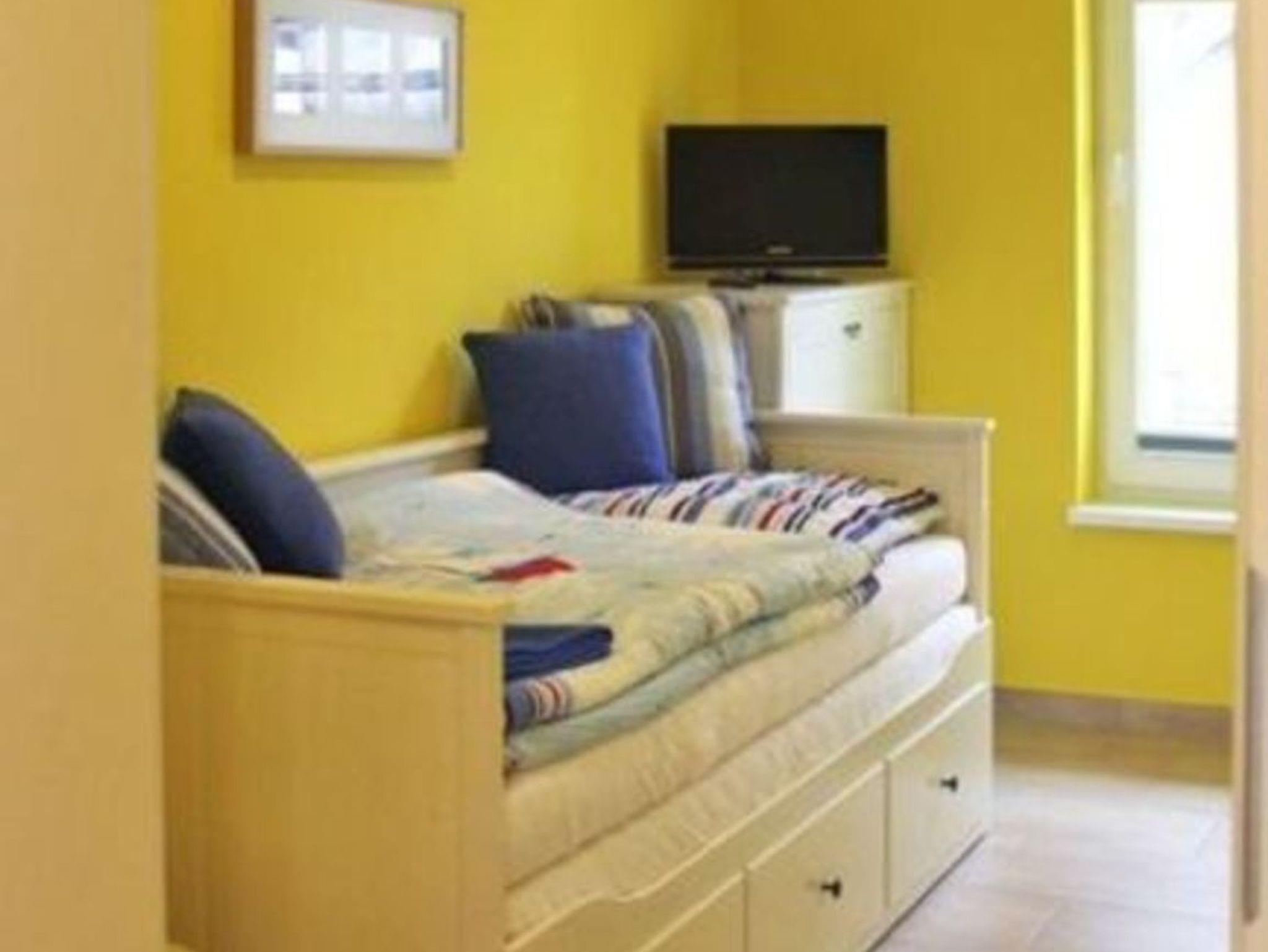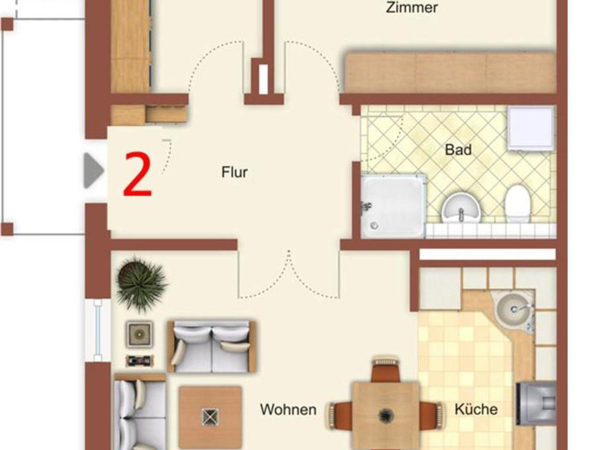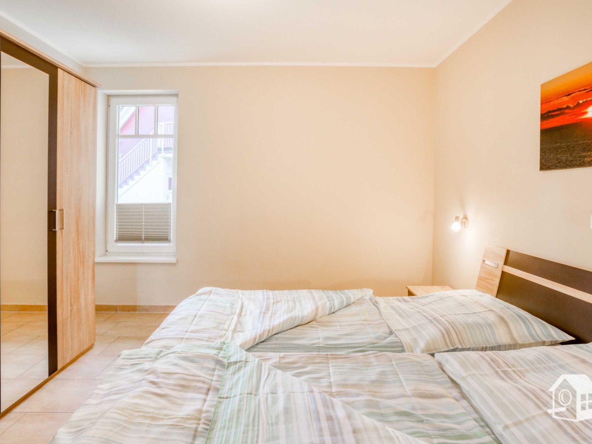 Die gesamte Wohnung ist mit einer Fußbodenheizung ausgestattet. Vom geräumigen Eingangsbereich aus, geht es in das komplett geflieste Badezimmer mit ebenerdiger Dusche, WC, Waschbecken und Waschmaschine. Im großen Schlafzimmer finden Sie u. a. ein Doppelbett sowie einen geräumigen Kleiderschrank. Zwei weitere Schlafmöglichkeiten gibt es im kleinen Schlafzimmer. Hier steht Ihnen ein Ausziehbett (ebene Liegefläche von 1,60m x 2,00m) zur Verfügung. Auch ein kleiner LCD-Fernseher (DVB-S) mit allen Anschlussmöglichkeiten befindet sich hier.
