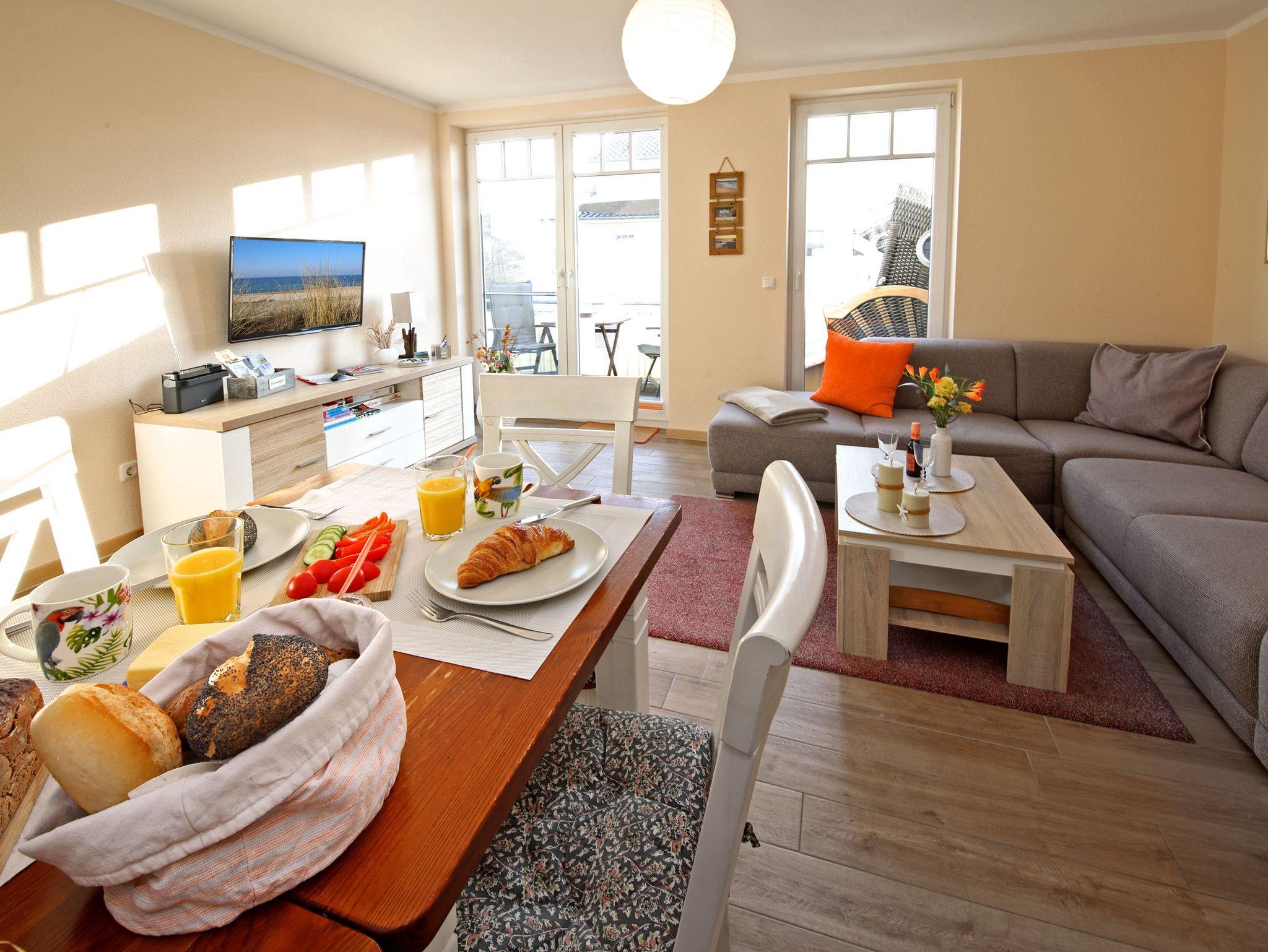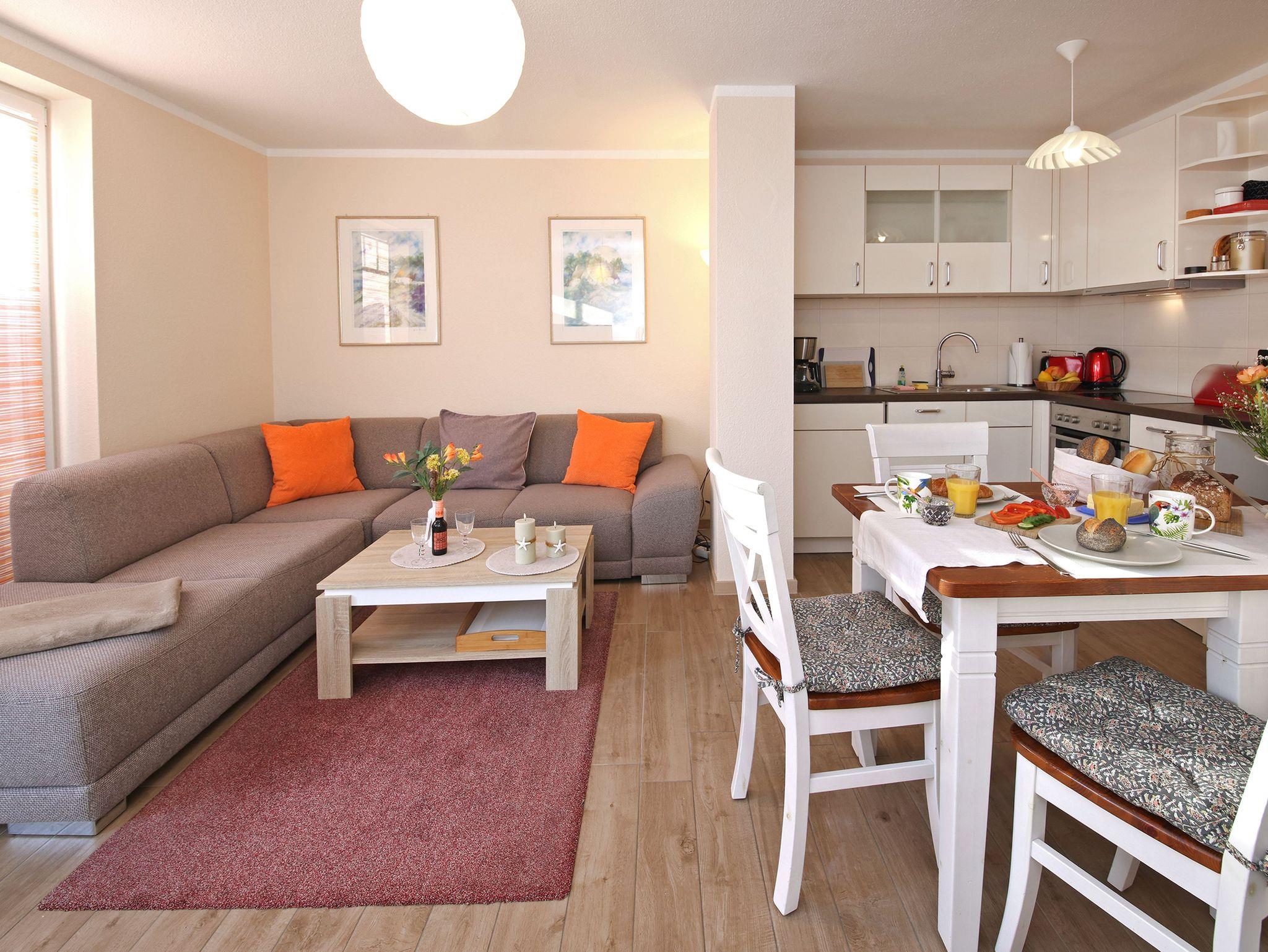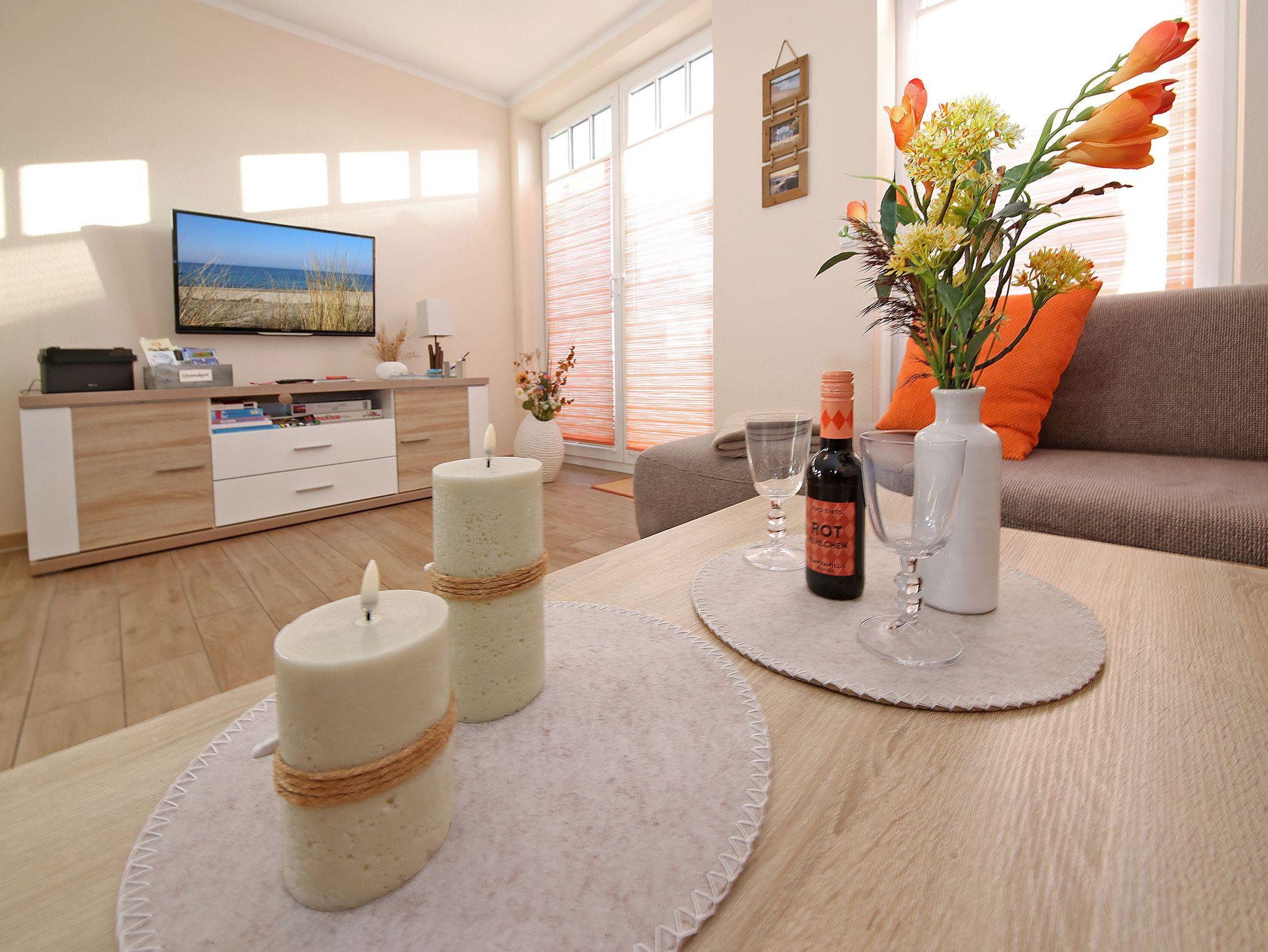 Im Schlafzimmer befindet sich ein Doppelbett mit den Maßen 1,80 x 2,00 m. Eine Schlafcouch für 2 Personen finden Sie im Wohnzimmer. Insgesamt bietet unser Appartement Platz für bis zu 4 Personen. LCD-Fernseher und Radio bieten Unterhaltung in unserer Ferienwohnung. Im offenen Wohnzimmer befindet sich eine integrierte hochwertige Einbauküche mit Geschirrspüler, Herd mit Cerankochfeld, Backofen, Wasserkocher, Toaster, Kaffeemaschine und Kühlschrank mit Gefriermöglichkeit. Das moderne ist mit einer großen fast ebenerdigen Dusche und Handtuchwärmer ausgestattet. Die Sonne kann man ab späten Vormittag bis zum Untergang auf dem großen Süd West Balkon, den man auch über das Schlafzimmer erreichen kann, genießen. So entspannt können Sie die Urlaubstage bei einem Glas Wein und guter Unterhaltung ausklingen lassen. Für unsere kleinen Gäste stehen ein Reisebabybett sowie ein Kinderhochstuhl kostenfrei zur Verfügung. Wir stellen unseren Gästen auch eine Waschmaschine kostenfrei zur Verfügung, diese befindet sich direkt im Appartement. Ebenfalls nutzen unsere Gäste in unserem Appartement einen kostenfreien W-LAN Anschluss. Unser modern eingerichtetes App. liegt nur 250 m vom Ostseestrand entfernt und ist entspannt in 3 Minuten zu Fuß zu erreichen. Das Naturschutzgebiet Conventer Niederung befindet sich in unmittelbarer Nachbarschaft. Der großzügige Flurbereich lädt ein in die Nichtraucherwohnung, die mit einer modernen gehobenen Ausstattung versehen ist. Der PKW-Stellplatz befindet sich direkt vor dem Ferienhaus und ist damit sehr vorteilhaft durch den kurzen Weg zur Ferienwohnung. Wir bitten Bettwäsche und Handtücher mitzubringen.