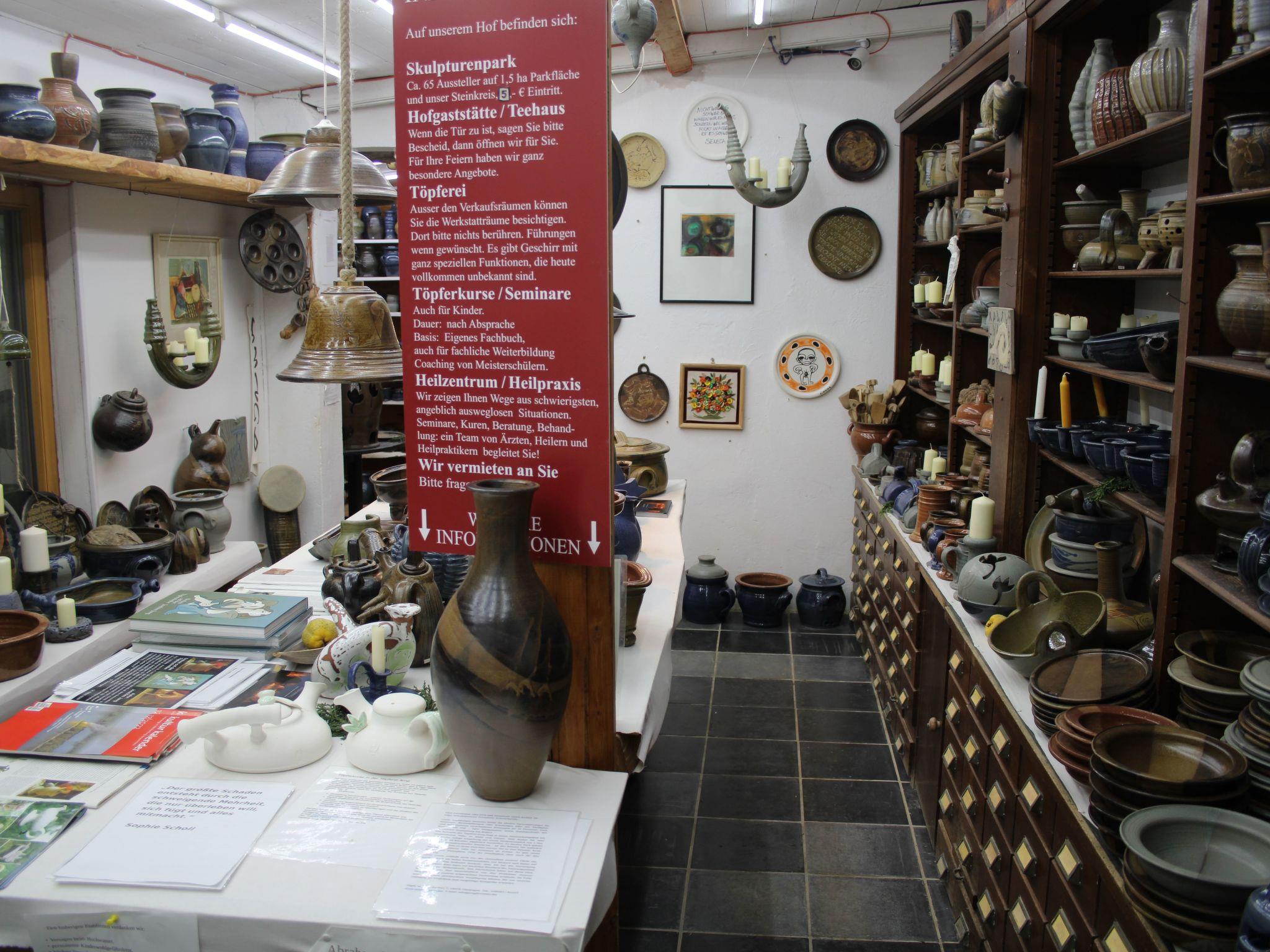 The property includes a pottery, a tea house and a large park with the works of 70 artists and Germany's largest stone circle. You will also find other artistic workshops and a practice for alternative healing methods in the immediate vicinity. It is possible to book a course in the pottery.