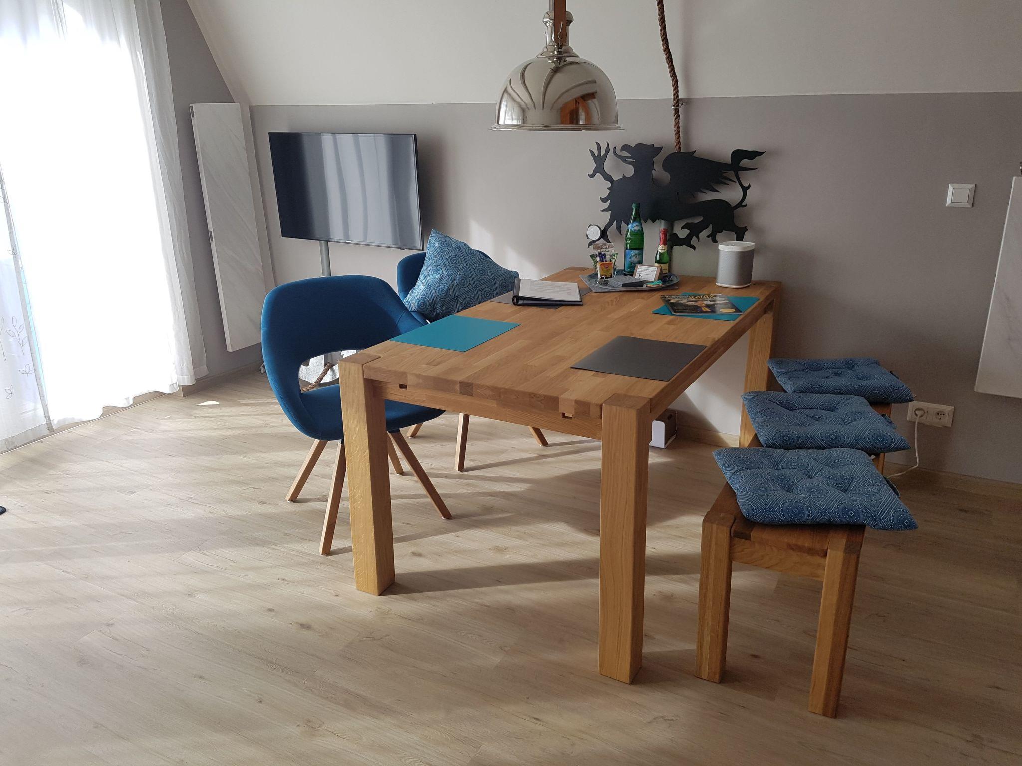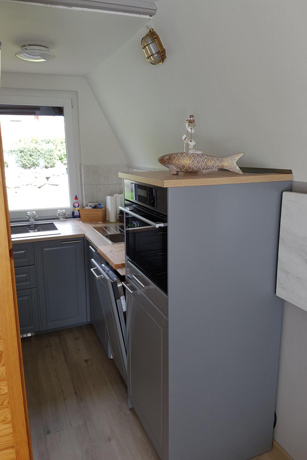 Tradition meets modernity - The classic thatched Finnhütte was renovated in 2017 and has modern furnishings. On an area of approx. 55m² on 2 floors you will find a spacious living and dining area, a fully equipped kitchen, bathroom with shower and upstairs two bedrooms with a double bed (1.80m) and a single bed (0.90m). In the light-flooded living area, the lounge sofa invites you to relax with music, a book or TV. The dining area with its solid wood furniture is ideal not only for dining, but also for cosy get-togethers, e.g. for games evenings. The kitchen is equipped with all the necessary electrical appliances (induction hob, oven with microwave, dishwasher, fridge, kettle, coffee machine and toaster). On the upper floor you sleep directly under the thatched roof in a solid wood double bed. In the second bedroom there is a single bed including seating and a small table. There are plenty of shelves and storage facilities, e.g. for clothes, on both floors. The Ankerplatz holiday home is equipped with a flat-screen TV (satellite) and music system (SONOS). WLAN is also available. Everything is also available for autumn, the turn of the year or winter, so that you can make yourself comfortable after a long walk or the fireworks on the beach, for example.