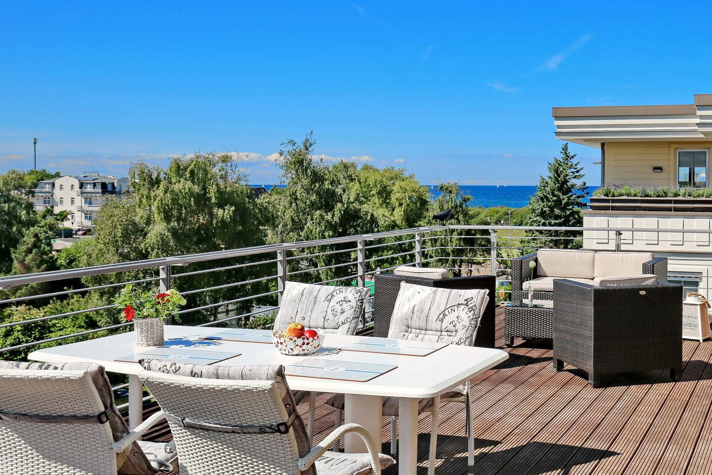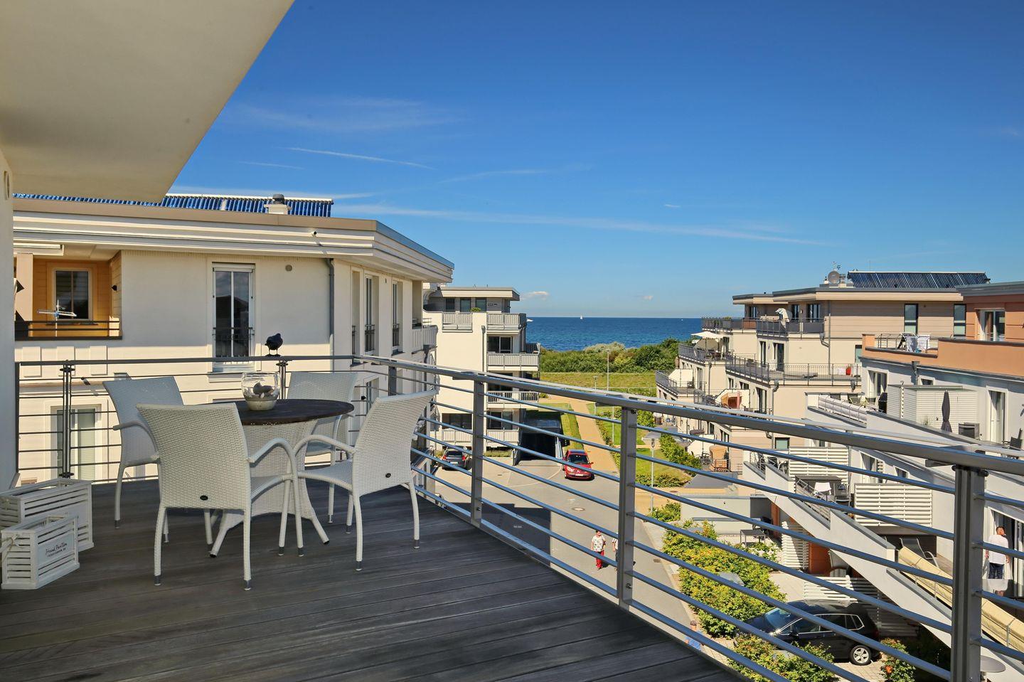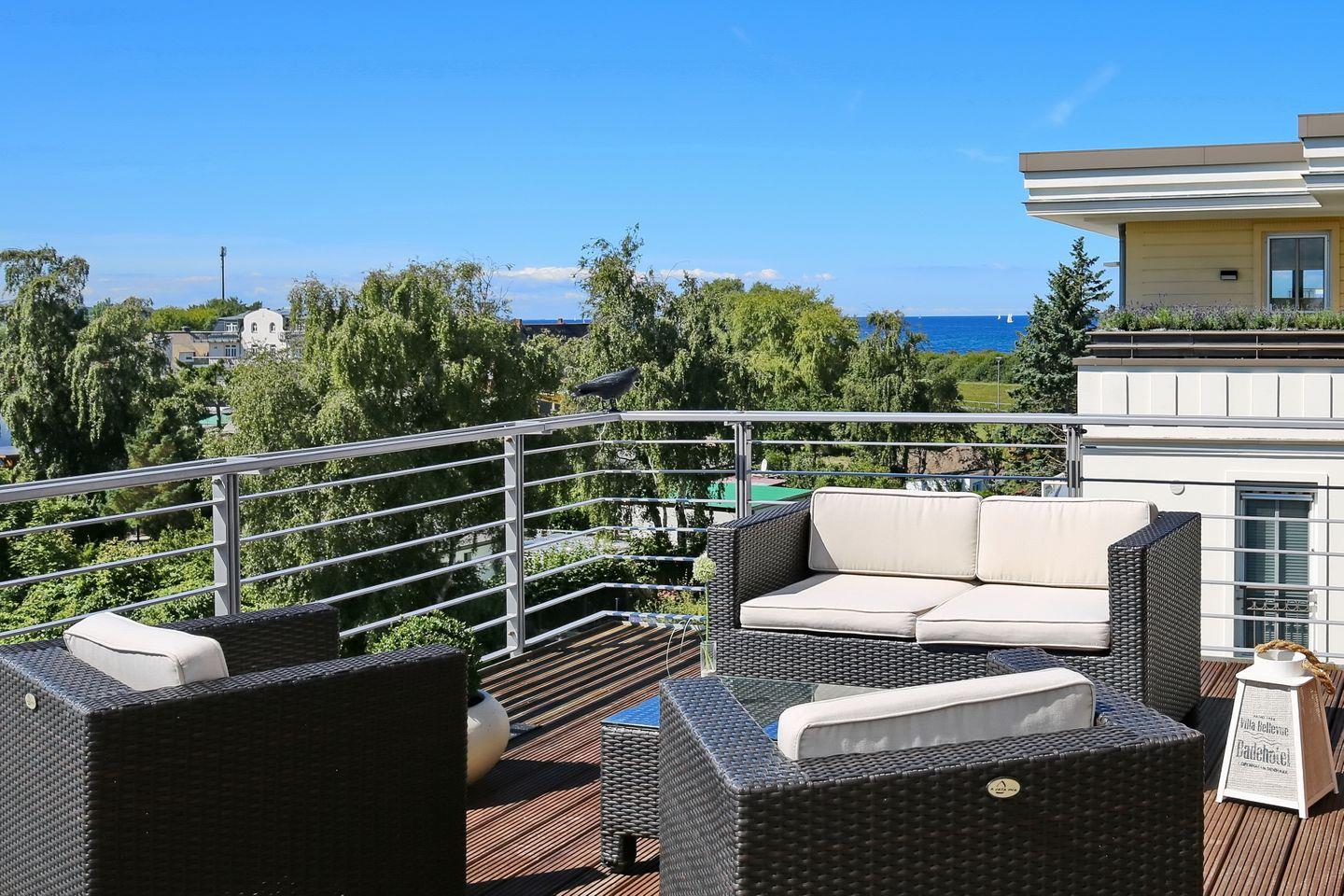Die stilvoll und maritim eingerichtete 58 m² große 3-Zimmer Penthouse Ferienwohnung besticht mit einer großen Dachterrasse in Süd-West-Ausrichtung und einem Balkon mit Ost-Ausrichtung und Blick zum Meer, sodass Sie den ganzen Tag in der Sonne genießen können. Der gemütliche Wohnbereich lädt zu entspannten Stunden ein. Die moderne Küche mit direkt angrenzendem Essbereich verspricht allem Komfort, den man sich wünscht. Die großzügige Ferienwohnung liegt im Dachgeschoss der Villa Sanddorn und ist nur 50 Meter vom Ostseestrand entfernt.