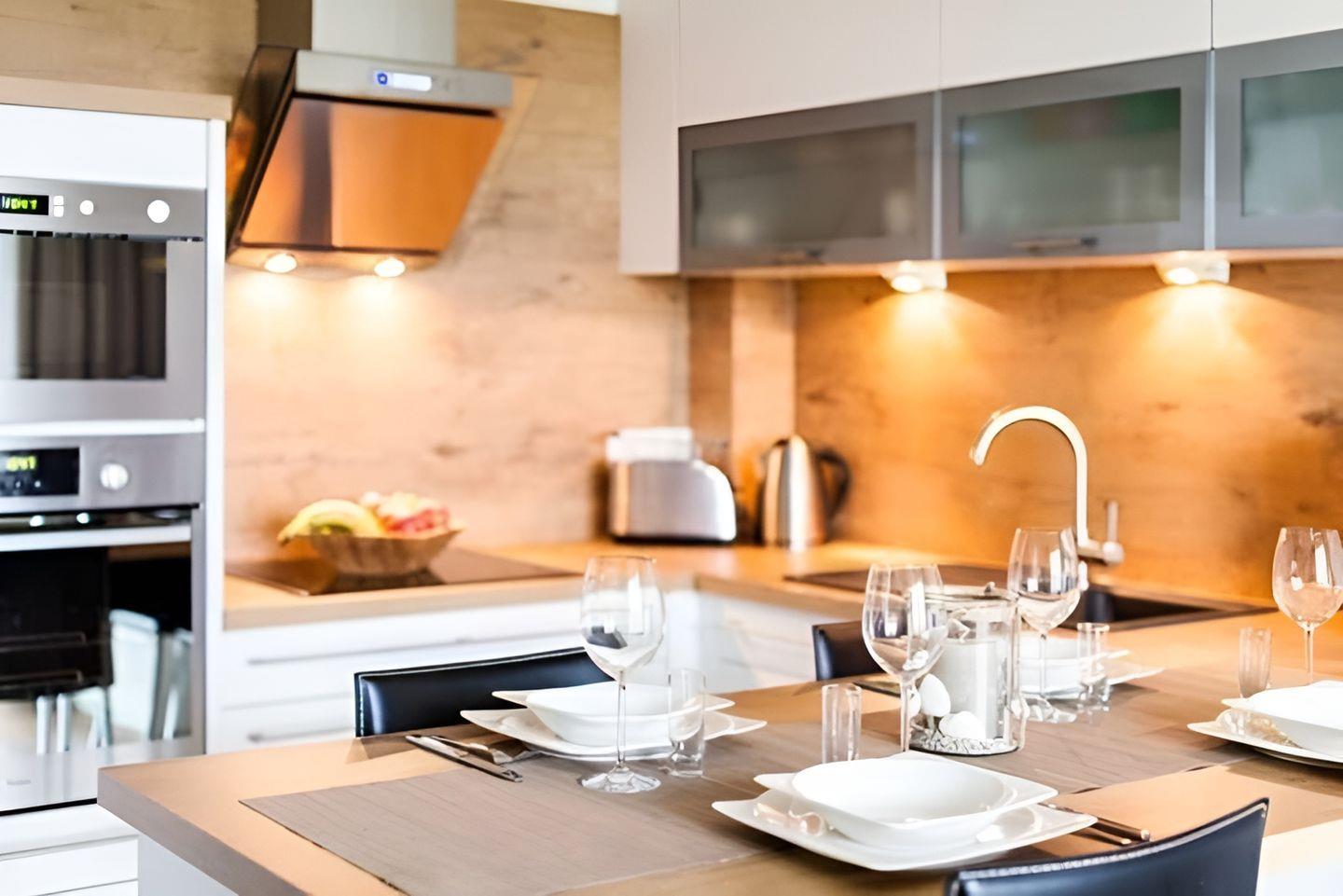 Küchentresen mit vier Stühlen aus hochwertigem Leder grenzt an eine komplett