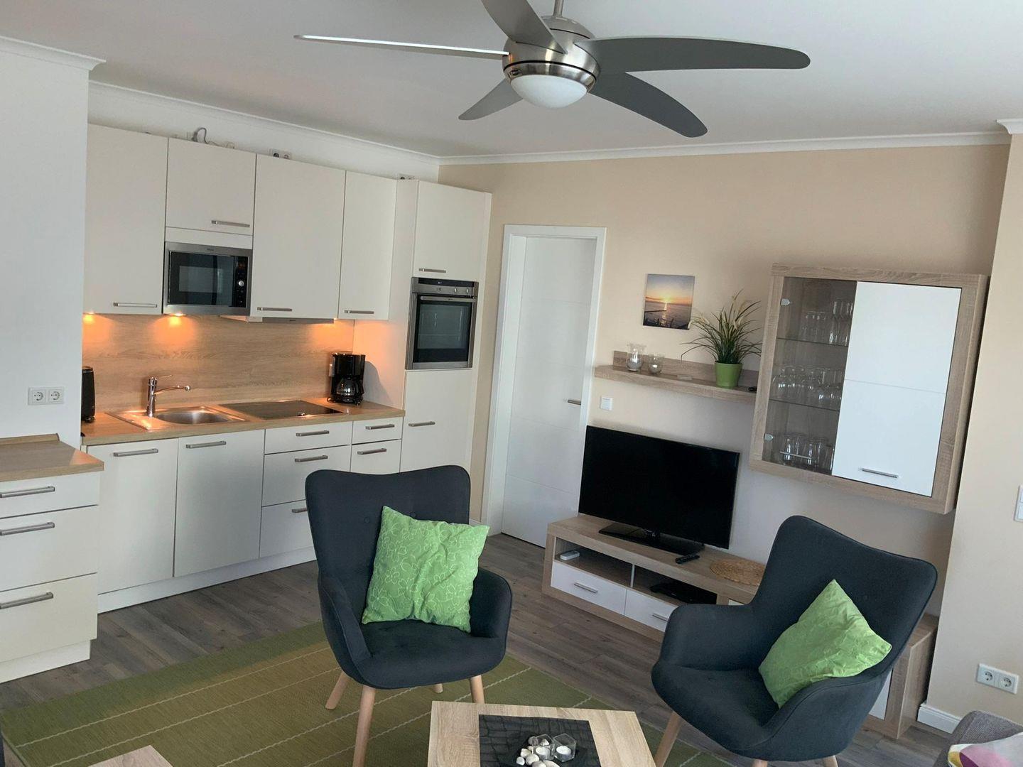 und DVD-Player. Im offenen Koch- und Essbereich finden Sie die Einbauküche und
