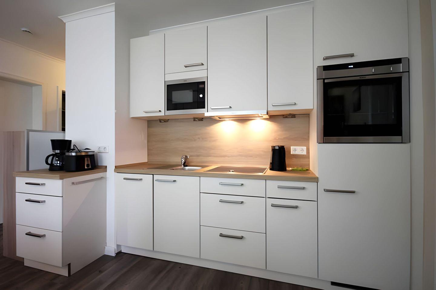 Kühlschrank, Backofen mit Cerankochfeld und Mikrowelle. Vom Wohnraum sowie vom