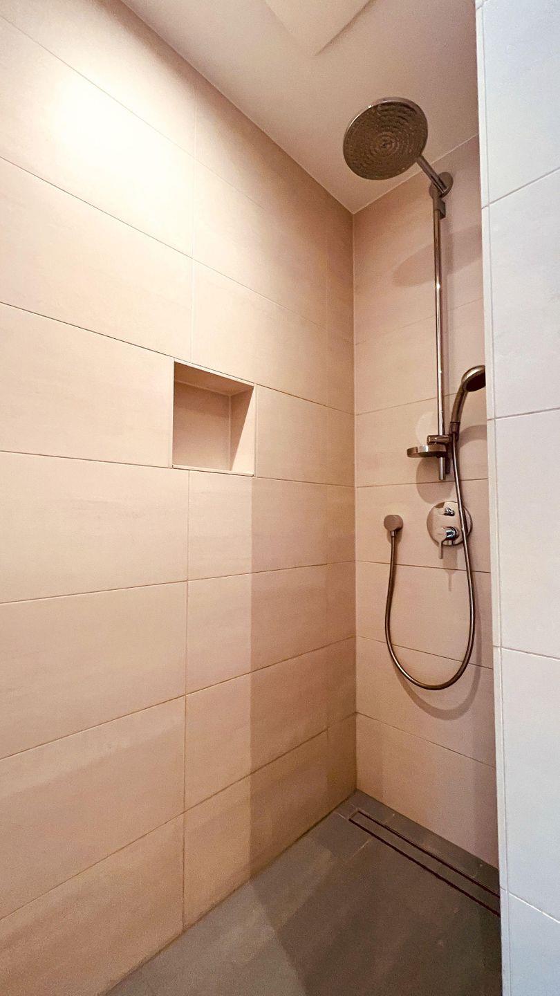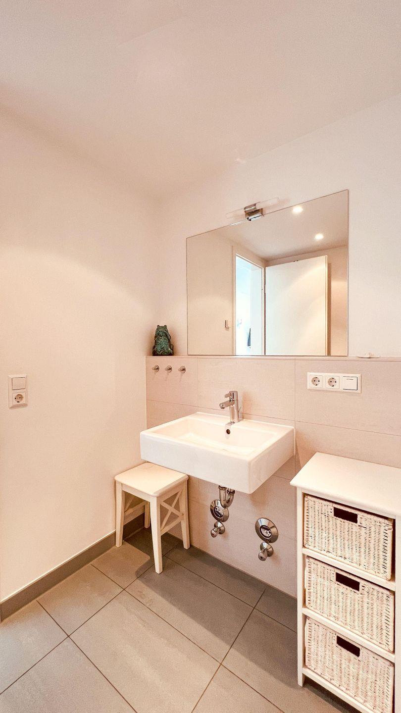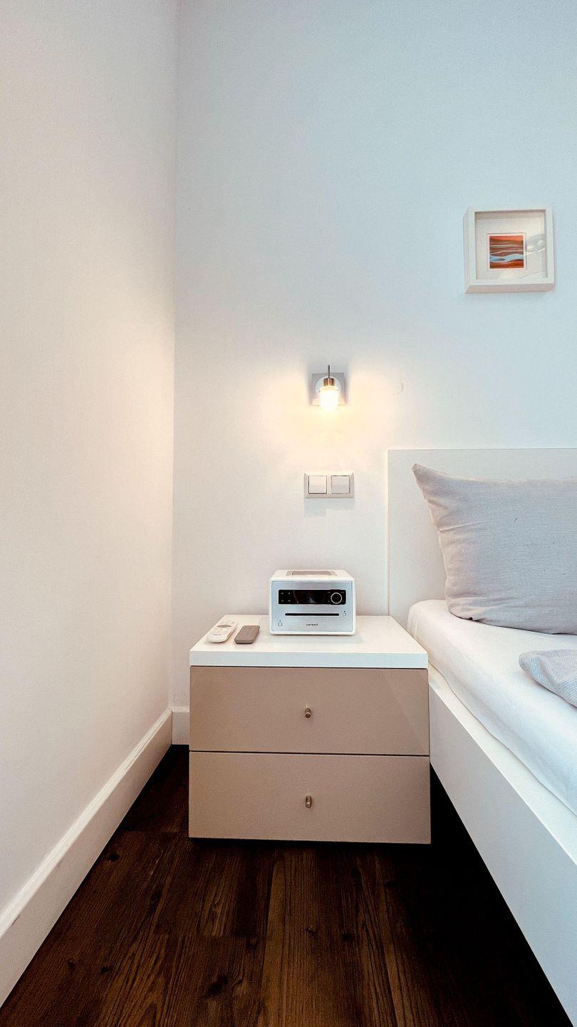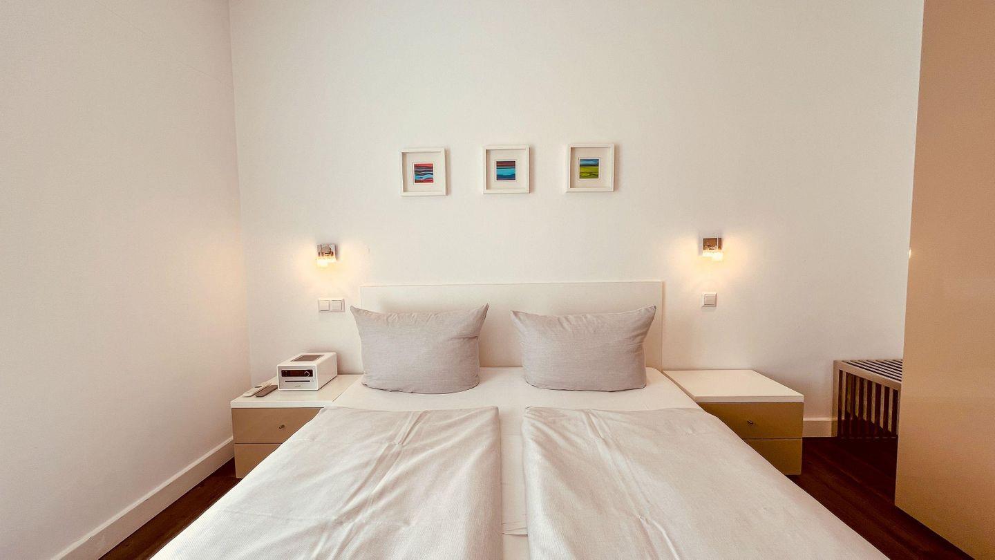 Im hellen SCHLAFRAUM steht ein Doppelbett für den entspannten Urlaubsschlaf zur Verfügung. Ein wandmontiertes-TV Gerät und ein Bluetooth-Radio mit CD-Player am Bett, erleichtern das Aufstehen im Urlaub. Als Stauraum steht eine Kofferablage zur Verfügung. Für die Urlaubshygiene ist das moderne DUSCHBAD entsprechend eingerichtet worden. Neben der fußbodengleichen Dusche gibt es einen Handtuchtrockner, einen Föhn, eine in die Wand integrierte Ablage und natürlich einen komfortablen Waschtisch mit großem beleuchtetem Spiegel. Wie der Schlafraum auch, ist der Zugang zur SAUNA über den Flur- Wohnbereich möglich. In dieser Ferienwohnung ist die Entspannung in der Sauna kostenlos.