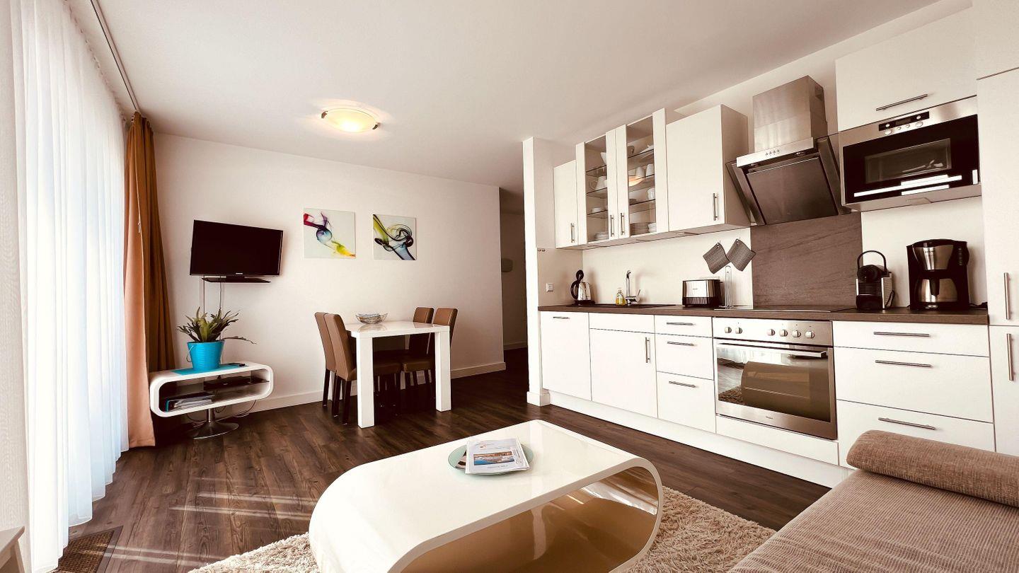Der WOHNBEREICH dieser freundlichen Ferienwohnung wartet auf Sie mit einer angenehmen Schlafcouch (144 x 204) als Aufbettung für einen dritten und vierten Gast. Sollte mal kein Strandwetter sein, sorgen Sie mit einem TV-Gerät und einer kleinen Stereoanlage für gute Laune. Im Wohnraum befindet sich auch der Esstisch mit vier gepolsterten Stühlen. Postiert gleich neben der OFFENEN KÜCHE. Die Küche selbst beinhaltet neben der Standardausrüstung einen Herd (4x Ceranfeld), Backofen, Geschirrspüler, Mikrowelle, eine „Nespresso Maschine“ sowie einen Kühlschrank, inklusive Gefrierfach.