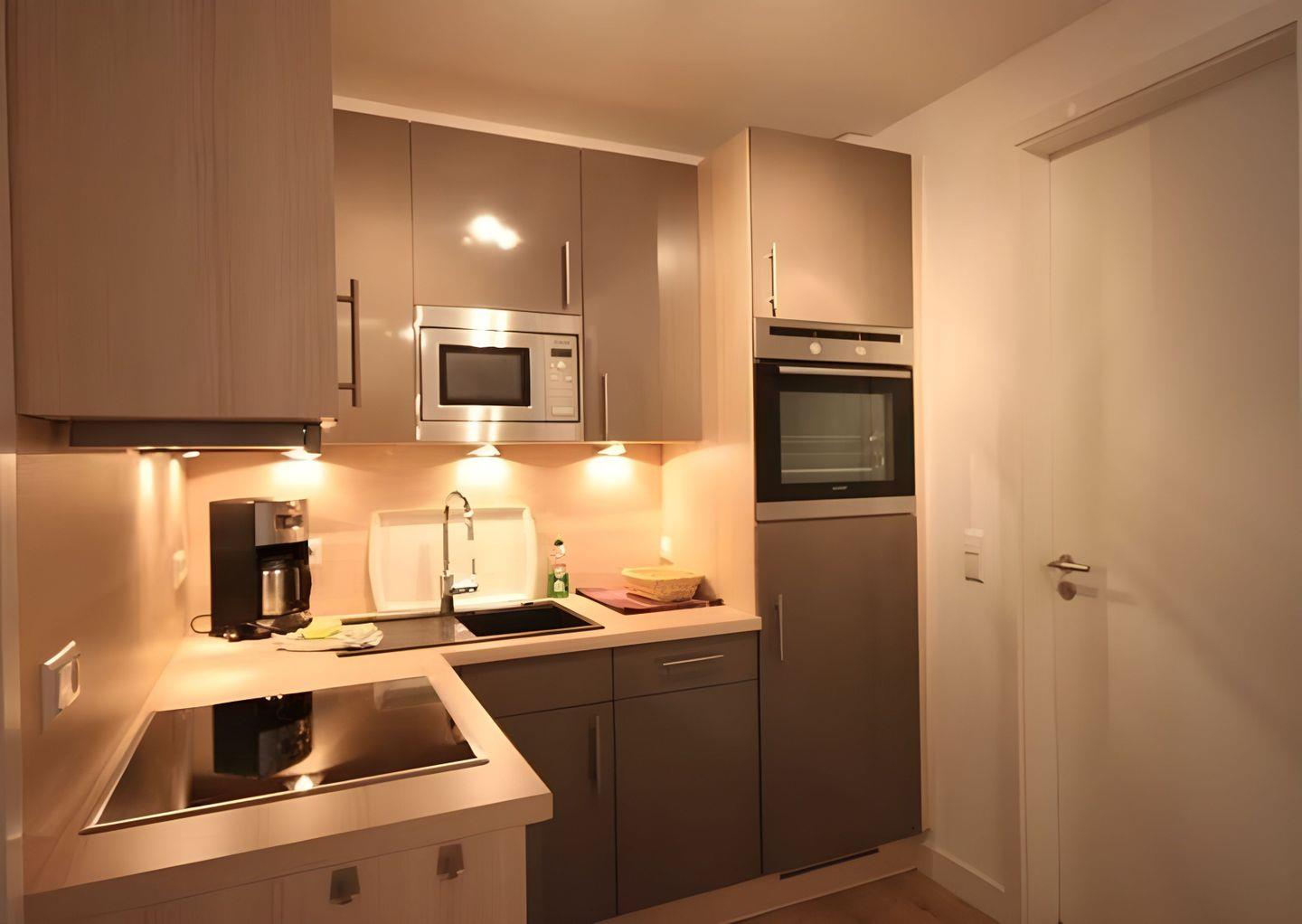Auf der großen, L-förmigen Couch im WOHNBEREICH lässt es sich wunderbar relaxen. Oder ausgezogen, als Bett nutzen. Ein TV-Gerät, ein Blu-ray-Player sowie eine kleine Stereoanlage stehen für Unterhaltung zur Verfügung. Im offenen KOCH- UND ESSBEREICH befinden sich eine komplett eingerichtete Küche mit schönem Holztisch und sechs Stühlen. Sie finden dort Mikrowelle, Backofen, Cerankochfeld, Geschirrspüler und Kühlschrank, inklusive Gefrierfach.