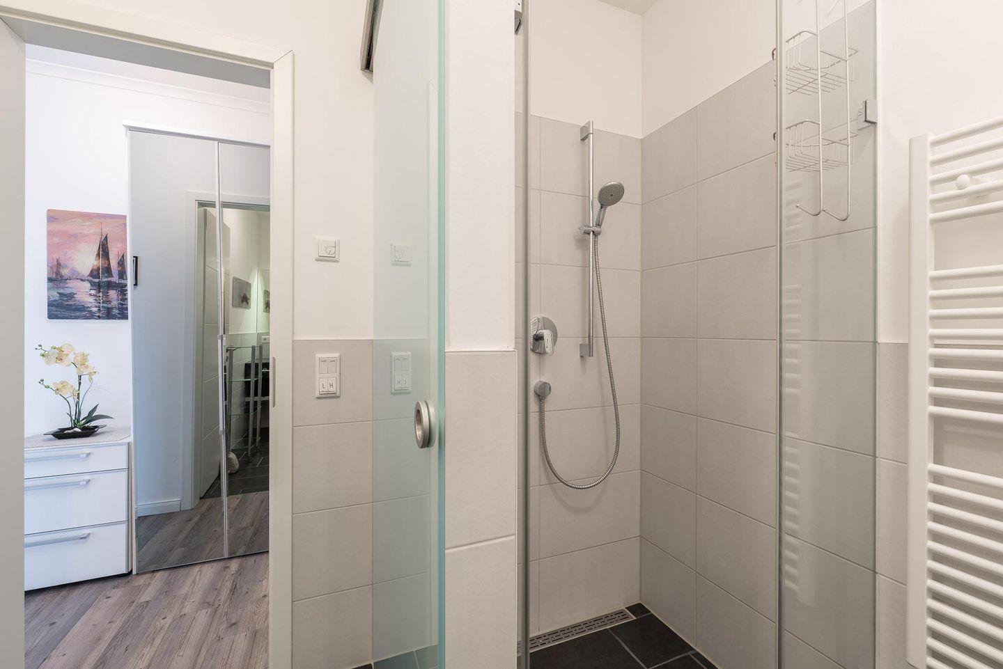 bodengleichen Dusche, einem Handtuchwärmer, einem breiten Waschtisch mit Spiegel