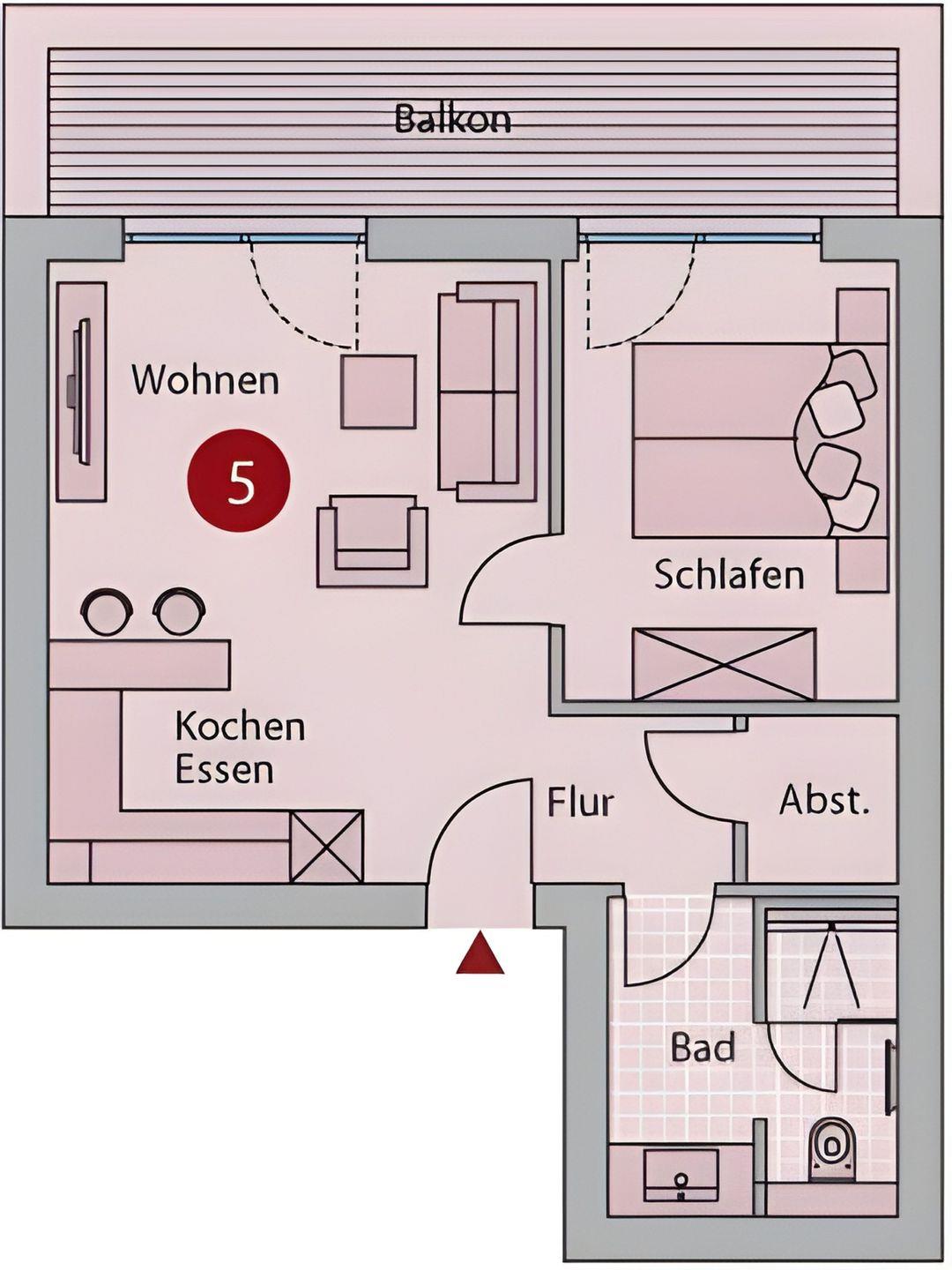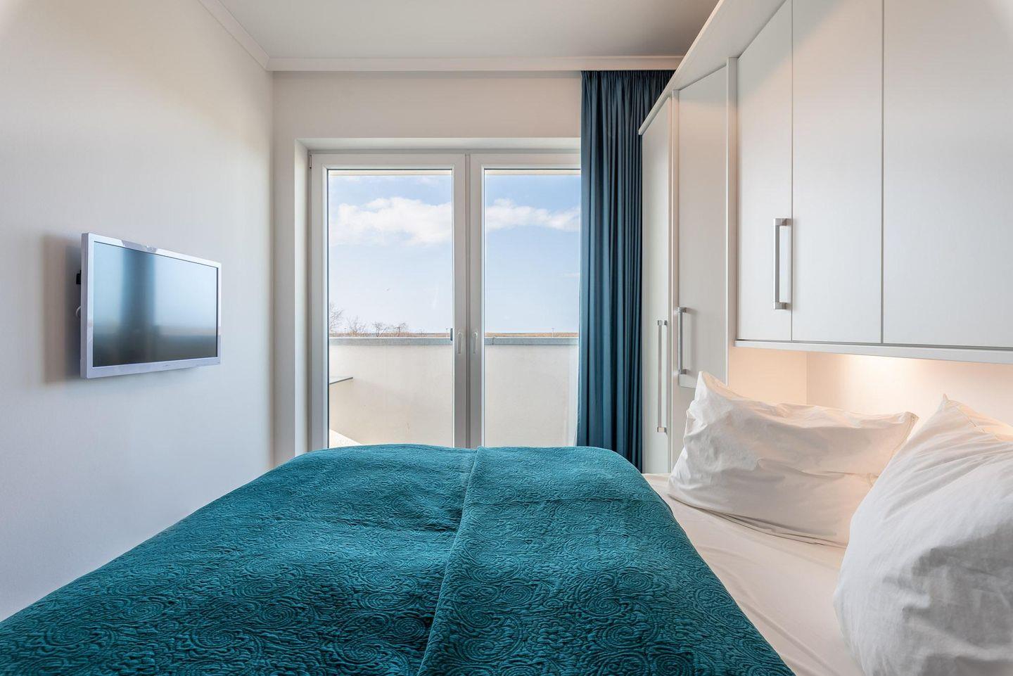 Schlafbereich haben Sie Zugang zum Balkon. Verdunkelungsgardinen sind in beiden