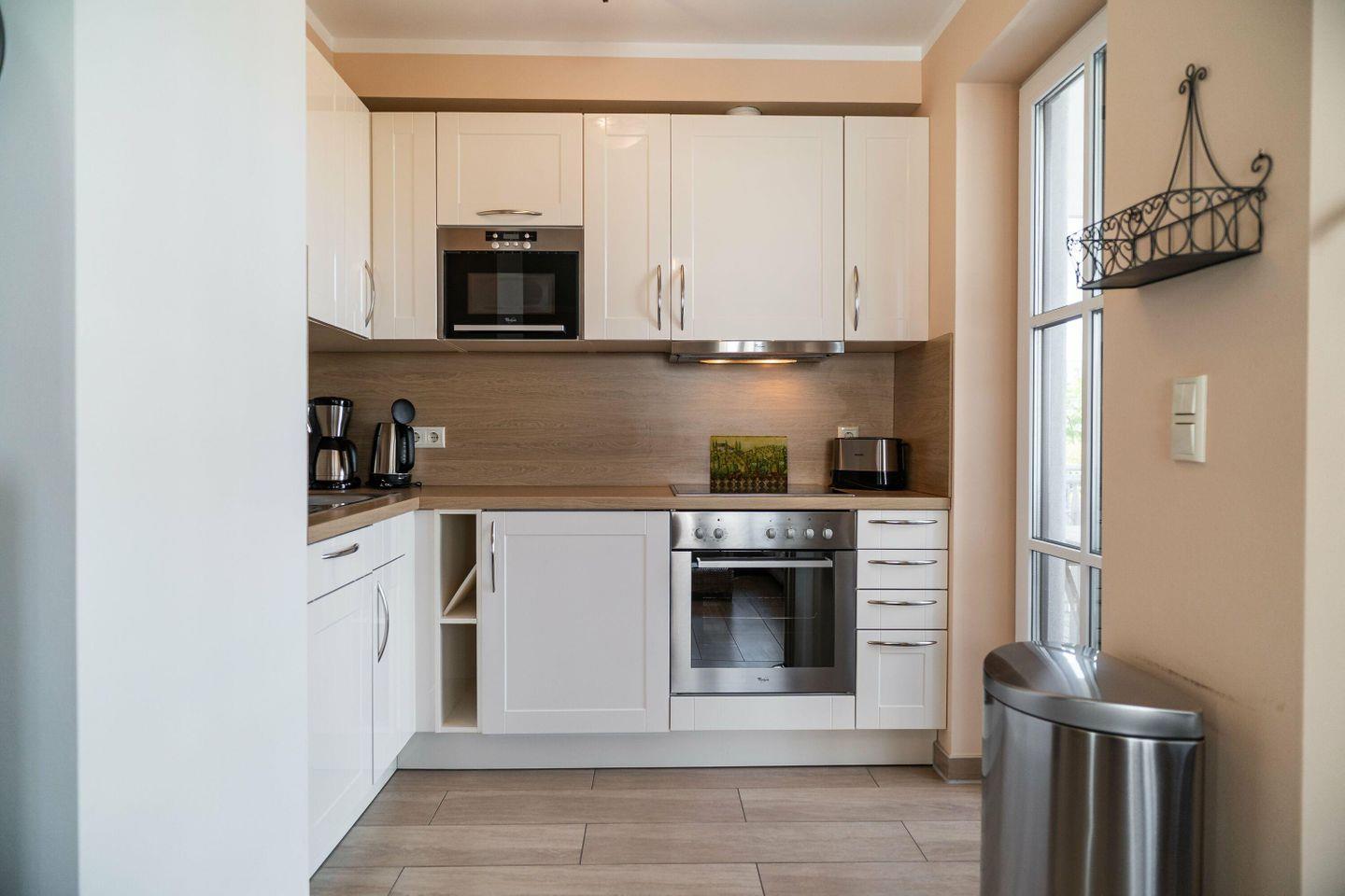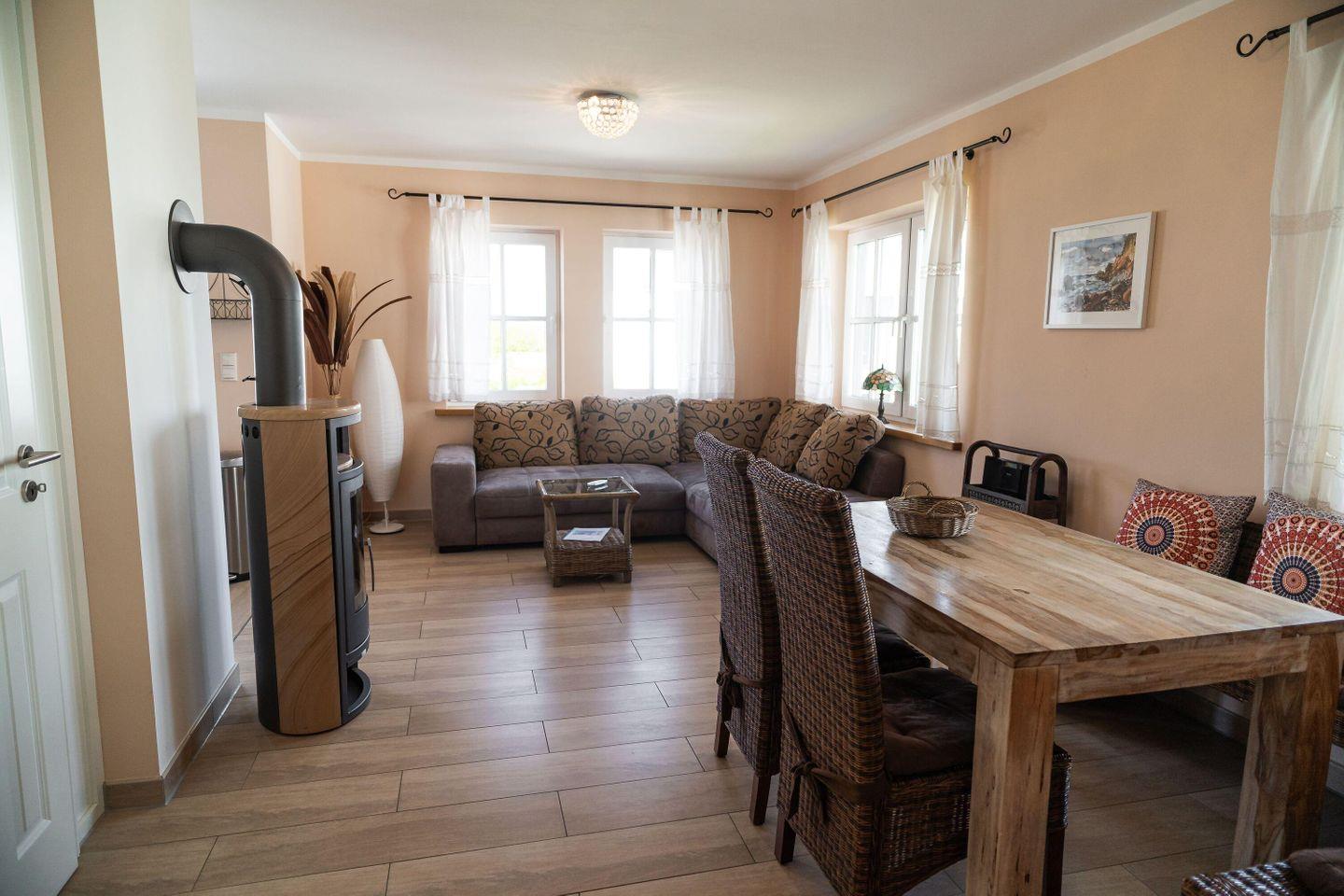 Die voll ausgestattete OFFENE KÜCHE beinhaltet einen Kühlschrank mit Gefrierfach, einen Backofen und einen Geschirrspüler. Selbstverständlich stehen Ihnen auch eine Filter-kaffeemaschine, ein Wasserkocher, ein Toaster und eine Mikrowelle zur Verfügung. Der Essbereich lädt mit einem großen Esstisch, zwei Stühlen und einer bequemen Sitzecke (Eckbank) zu gemeinsamen Mahlzeiten und geselligen Spielabenden ein.