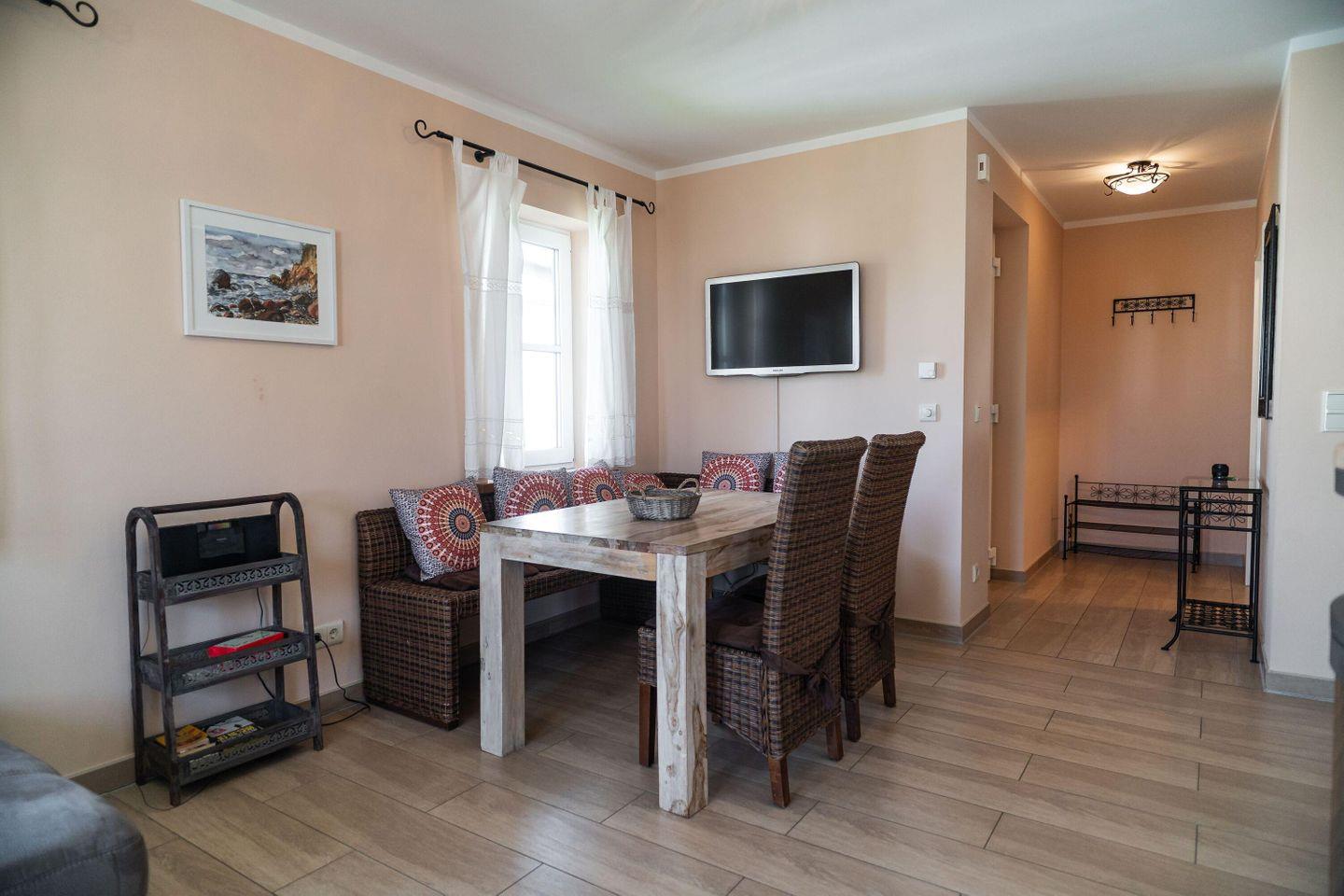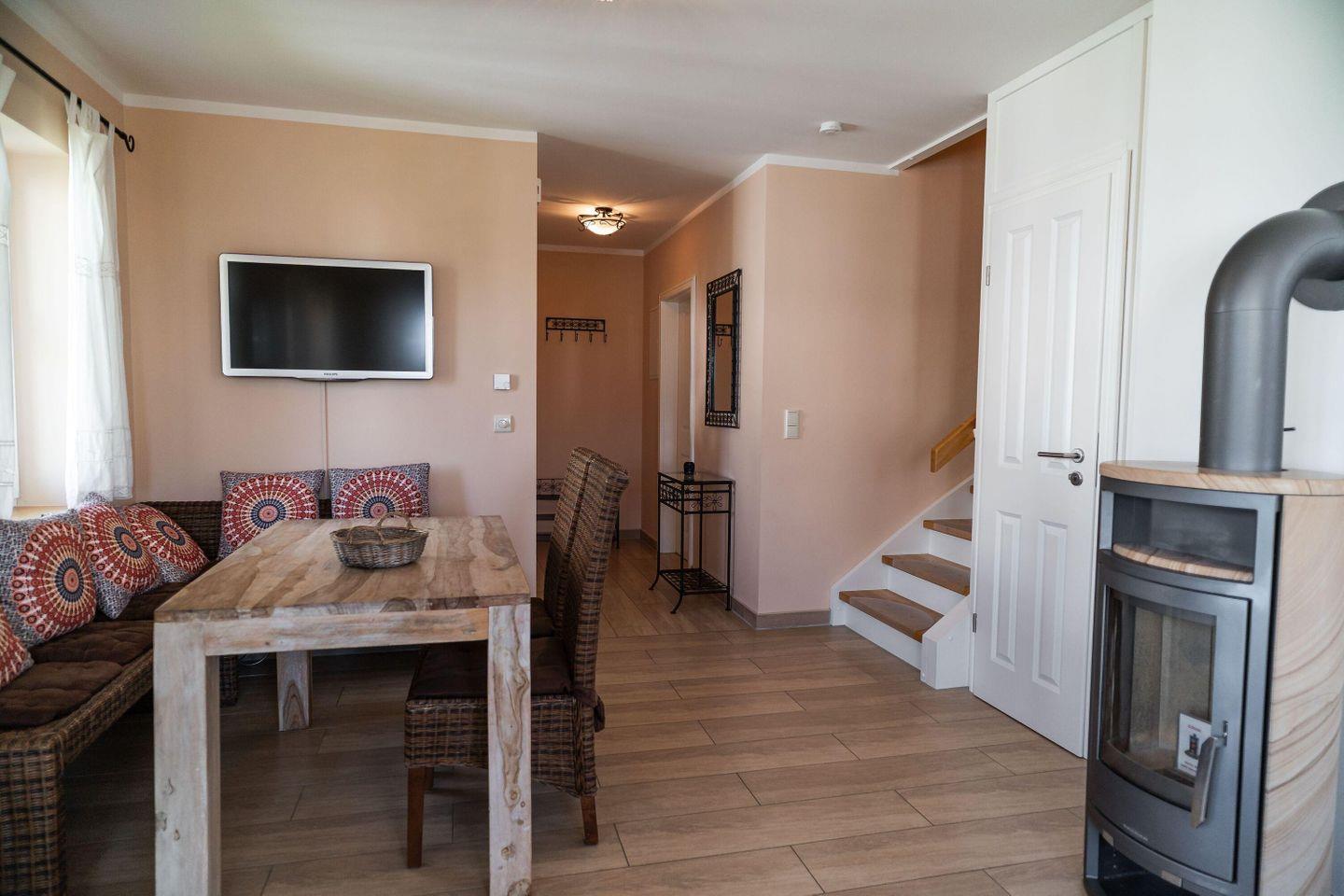 Das in „Mandelcreme“ gestaltete Ambiente des WOHNRAUMS harmoniert hervorragend mit den vielen Holzelementen, die hier vorhanden sind. Ein Hingucker für Freunde der Harmonie. Bei regnerischen Tagen ist durch eine gute Multimediaausstattung in Form von einem TV-Flatscreen, einem Radio, einem CD-Player und einer kleinen Spielesammlung für angenehme Abwechslung gesorgt.