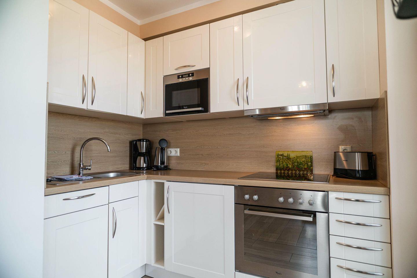 Die ca. 64 m² große sonnendurchflutete Ferienwohnung Parkresidenz WE 04 im 1. Stock bietet Meerblick, zwei Schlafzimmer, einen großzügigen, offen gestalteten Wohn- und Küchenbereich, einen Balkon sowie einen kostenlosen Privatparkplatz. Die Ausstattung umfasst bodengleiche Dusche, Spülmaschine, Ceranherd, Mikrowelle, TV mit Kabelanschluss, Haartrockner und WLAN. Strand, Restaurants und Stadtzentrum sind fußläufig erreichbar.