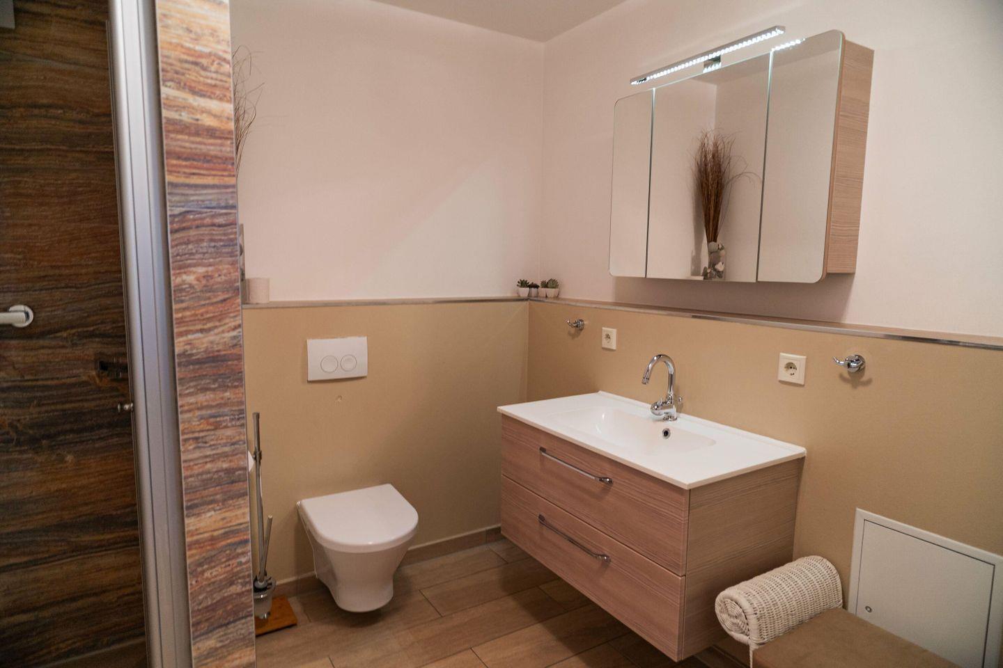 Spannende Fliesenoptik und eine bodengleiche Dusche erwartet Sie im BADEZIMMER. Hier befinden sich neben einem Waschtisch und großem Spiegel noch ein Haartrockner und eine Ablagemöglichkeit für Kleidungsstücke.
