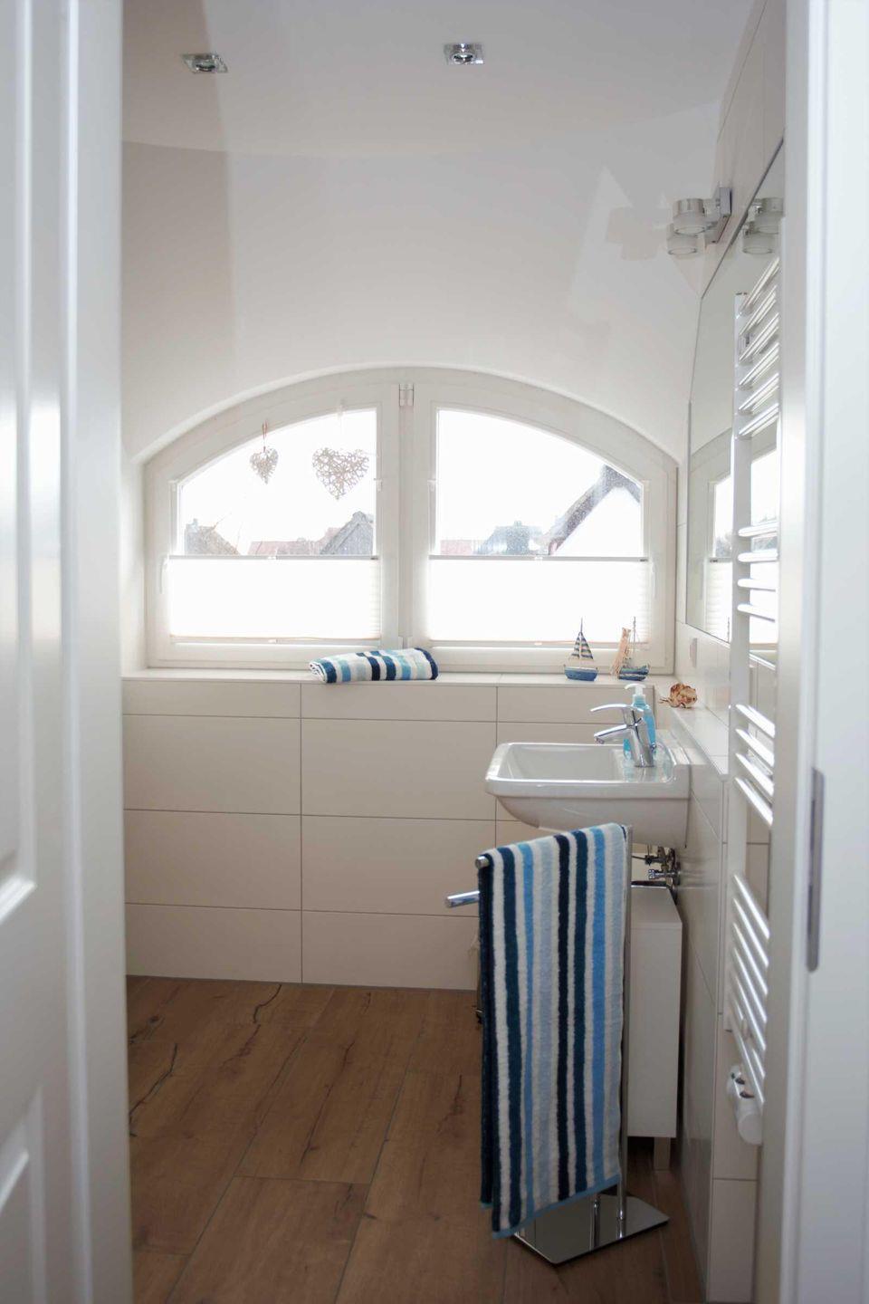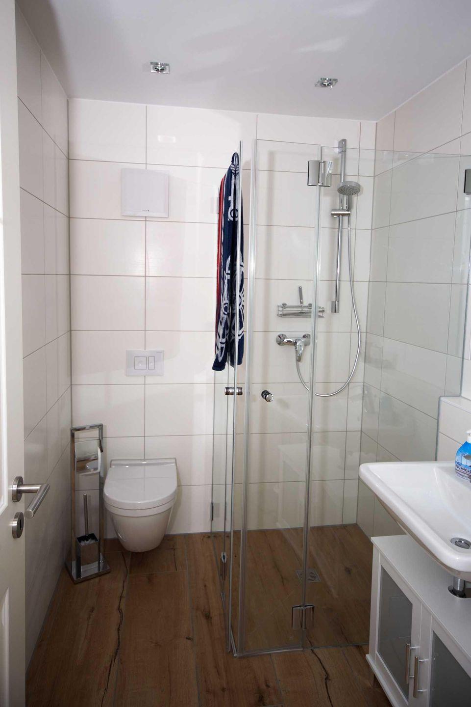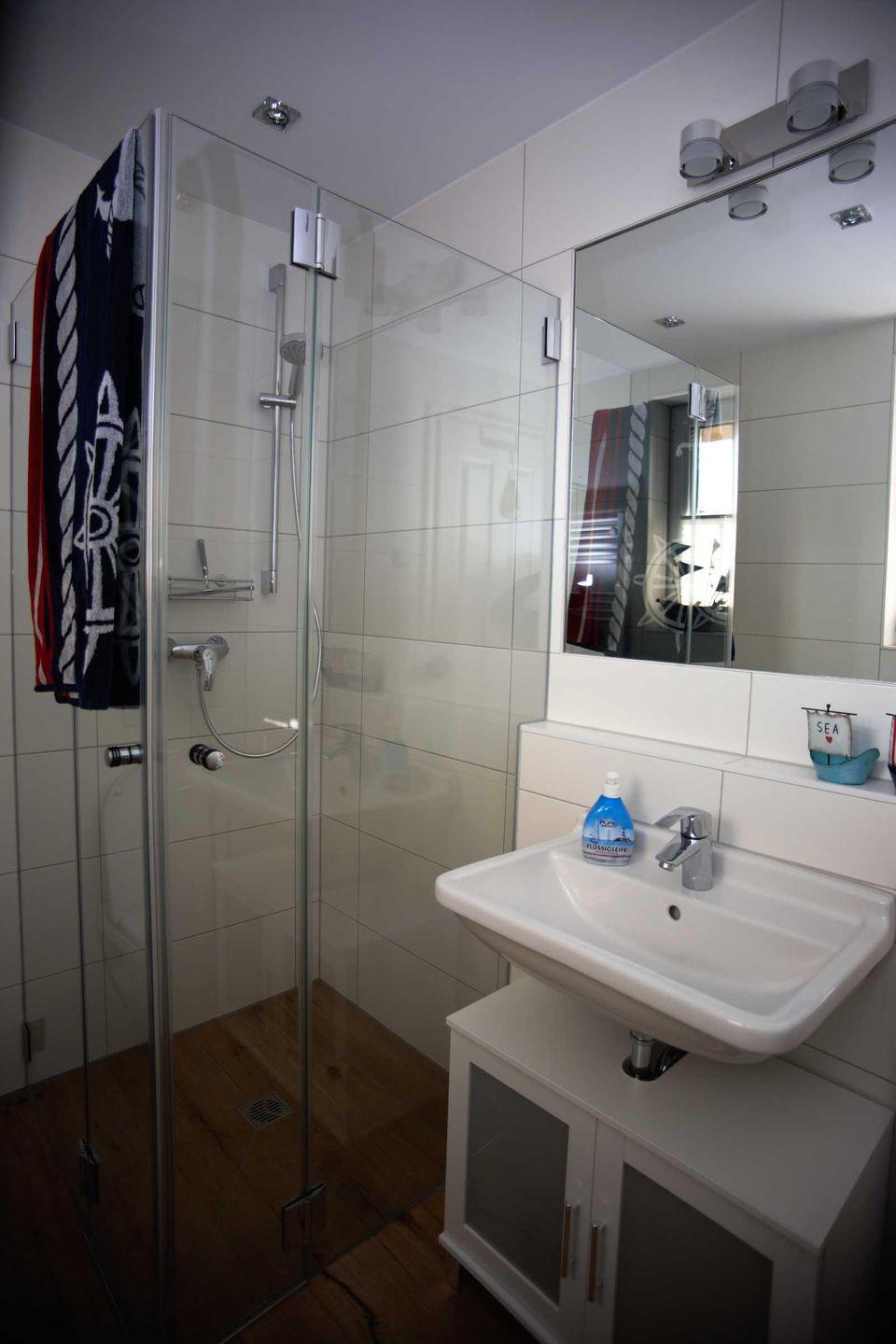 Im Erdgeschoss befindet sich der großzügig gestaltete Wohnbereich mit integrierter Küche und ein Duschbad. Der maritim eingerichtete Wohnbereich eignet sich ideal zum Entspannen nach einem ausgedehnten Strandspaziergang. Die modernen Elektronikgeräte wie wandhängender ein 60-Zoll-Flat-TV, ein Blu-ray-Player, ein DAB-Radio oder ein Spieleabend mit der Familie lassen die Zeit spaßig verfliegen. Die moderne Einbauküche sowie diverse Küchengeräte wie Geschirrspüler, Toaster, Kaffeemaschine, Wasserkocher, Mikrowelle, Herd mit Cerankochfeld, Backofen und Kühl-Gefrierkombination bieten ambitionierten Hobbyköchen auch im Urlaub die Möglichkeit Essen nach eigenen Wünschen zu kochen. Die Küche ist großzügig mit Ess- und Kochgeschirr, Besteck und Gläsern ausgestattet. Im hell gefliesten Duschbad mit Glasdusche, großem Waschtisch mit Unterschrank, darüber ein Wandspiegel, der in die Fliesenstruktur integriert wurde, einem WC, Föhn und Handtuchtrockner macht Körperhygiene Freude.