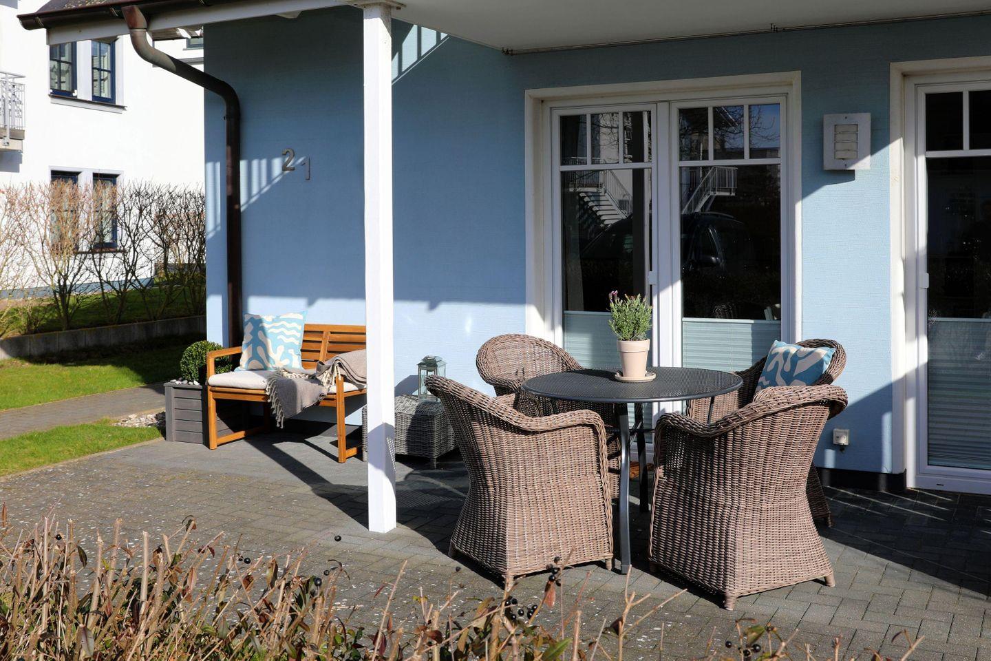 Auf die sonnige TERRASSE gelangen Sie direkt über den Wohnbereich. Gartenmöbel für ein entspanntes Frühstück oder Abendessen stehen für Sie bereit.