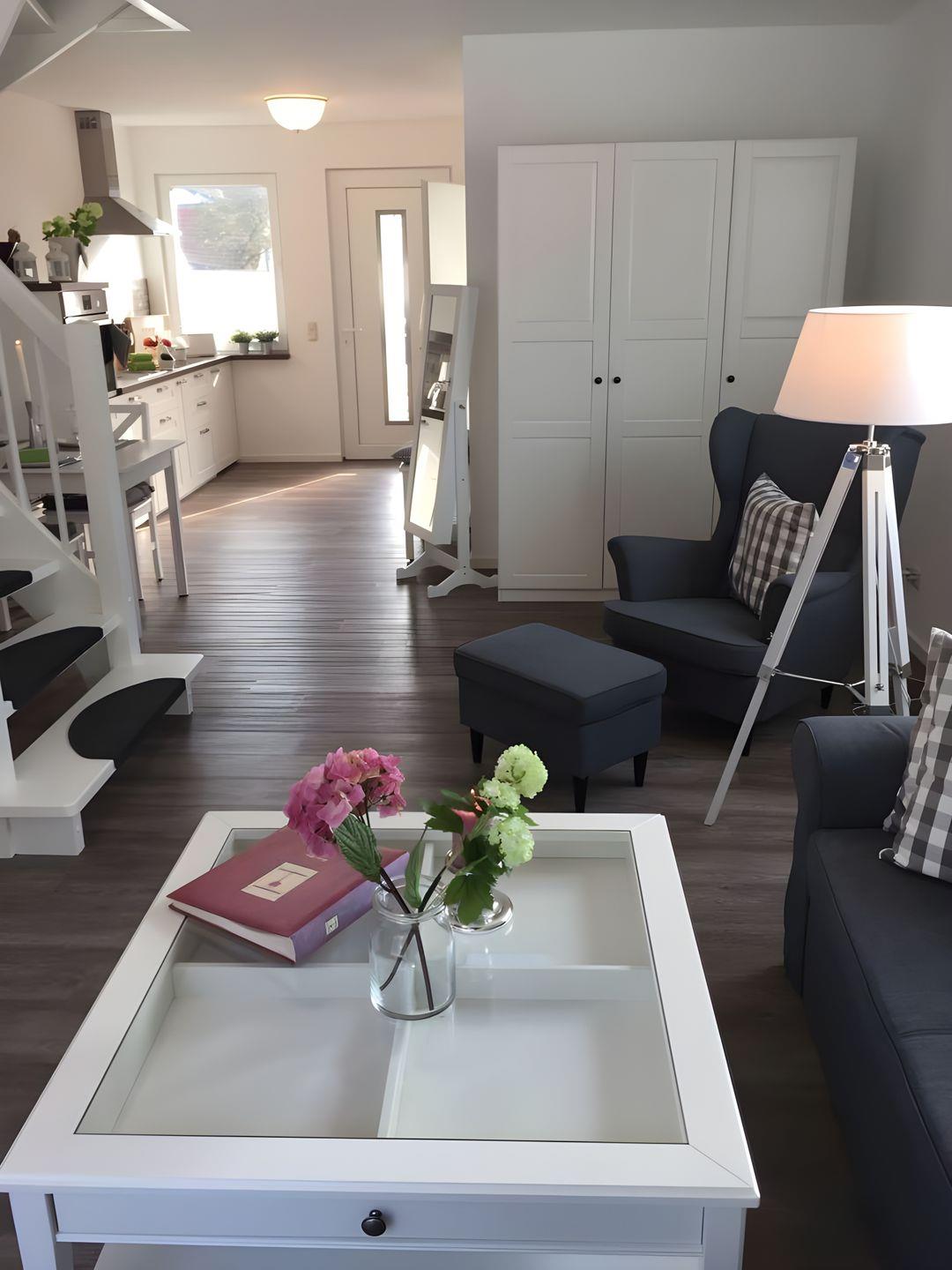 Das lichtdurchflutete Wohnzimmer mit Wohnküche ist mit einem gemütlichen
