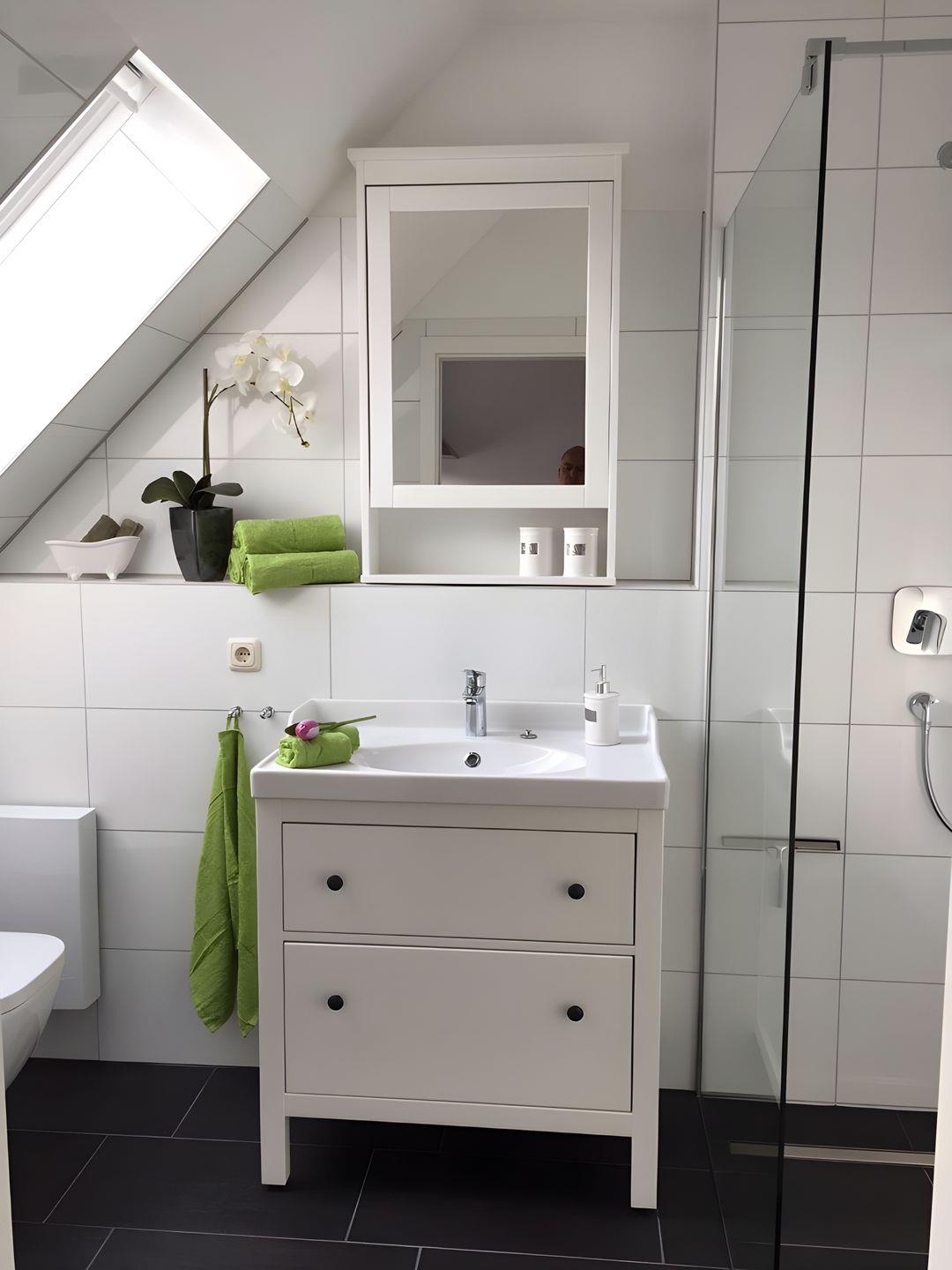 kleine Bad besticht mit ebenerdiger Dusche, geräumigem Waschtisch und Föhn.