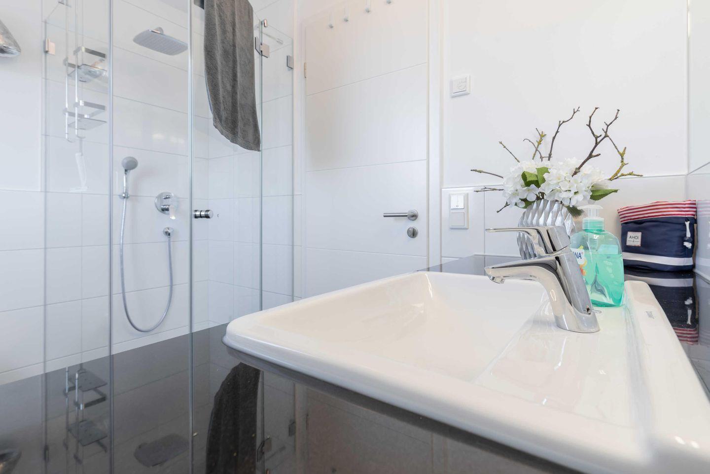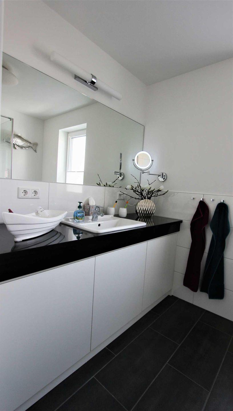 großen Wandspiegel und Waschtisch samt Einbauschrank ausgestattet. Weiterhin