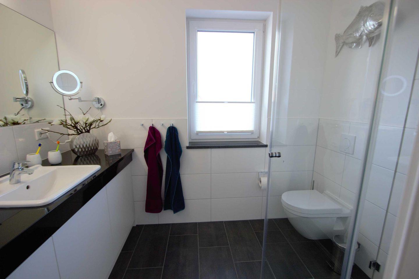 Das Bad mit Fenster ist mit einer ebenerdigen Regen-Dusche, einem beleuchten