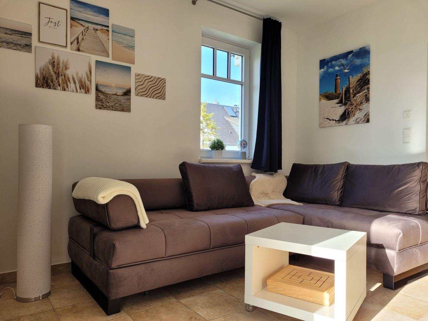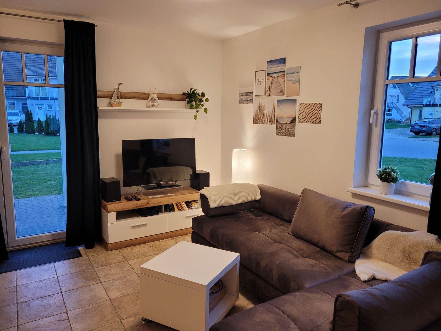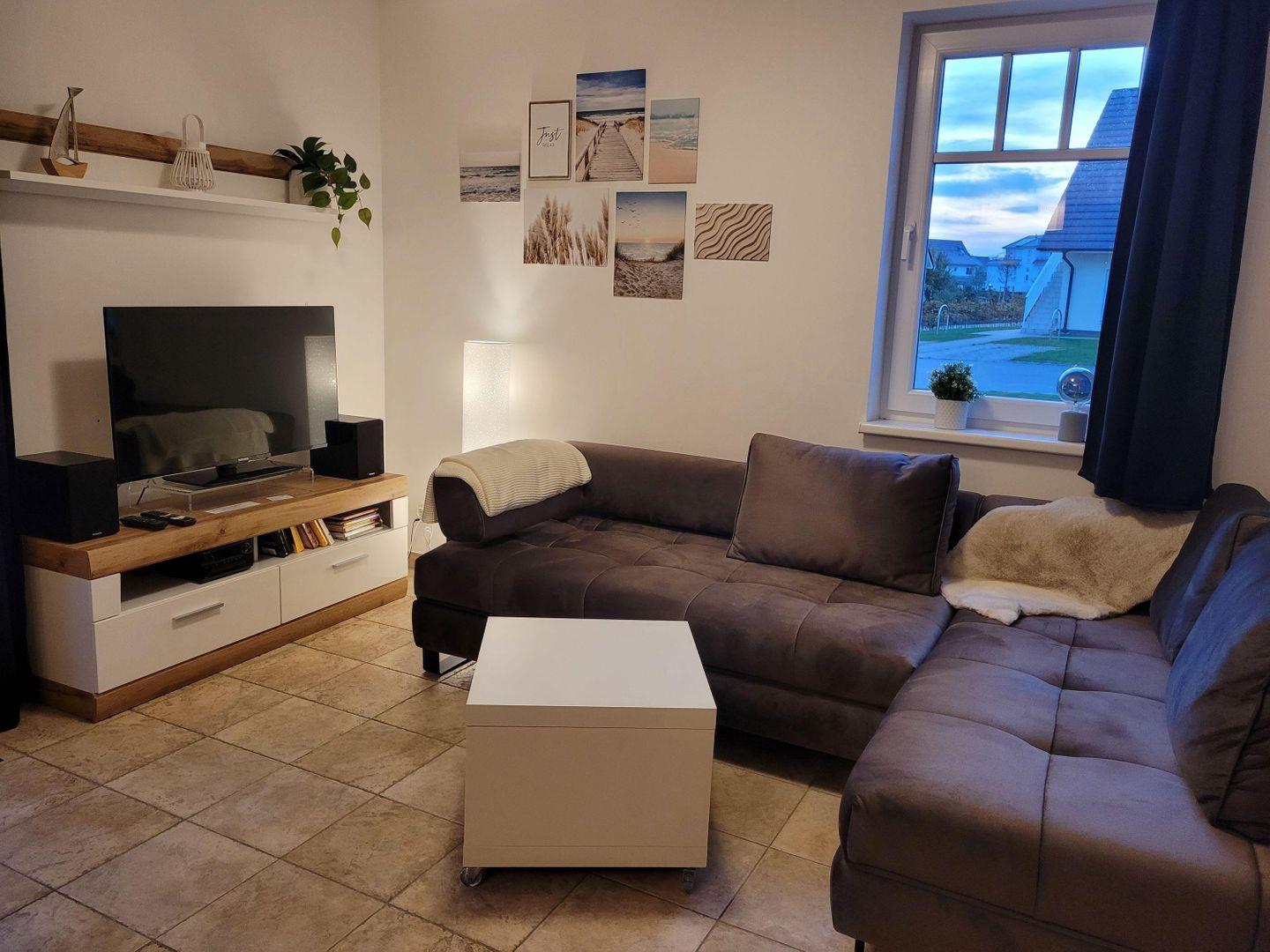 Das WOHNZIMMER mit großer (Schlaf-)Couch, Flat-TV und gemütlichem Essbereich lädt zum Verweilen ein. Die integrierte EINBAUKÜCHE ist mit Geschirrspüler, 4-Platten-Herd (kein Backofen), Dunstabzugshaube, Kühlschrank mit Gefrierfach, Filterkaffeemaschine, Eierkocher, Wasserkocher, Toaster und Mikrowelle ausgestattet. So lässt es sich gut gesättigt in den Tag oder einen langen Abend starten.