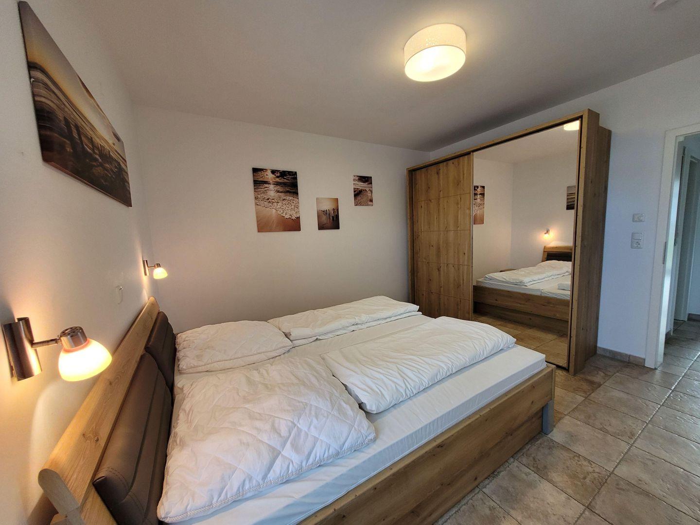 Das größere SCHLAFZIMMER empfängt Sie mit einem Doppelbett (180 x 200 cm/ getrennte Matratzen) und einem geräumigen Kleiderschrank für Ihr Gepäck. Im kleineren SCHLAFZIMMER befindet sich ein Doppelbett mit den Maßen 140 x 200 cm und reichlich Stauraum für Ihre Kleidung.