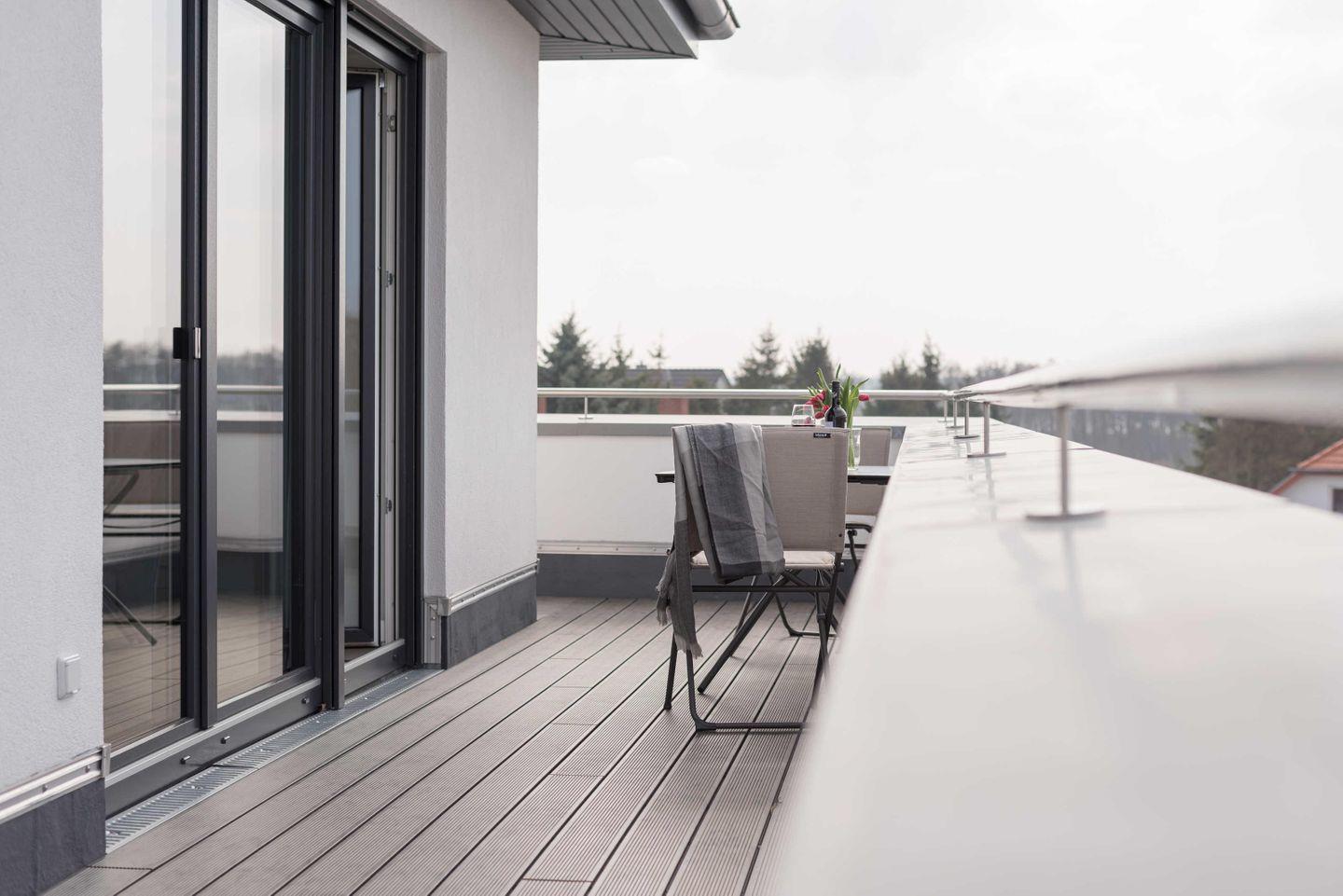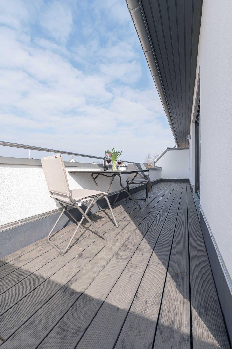 hier aus gelangen Sie auf die umlaufende Dachterrasse mit Tisch, vier Stühlen