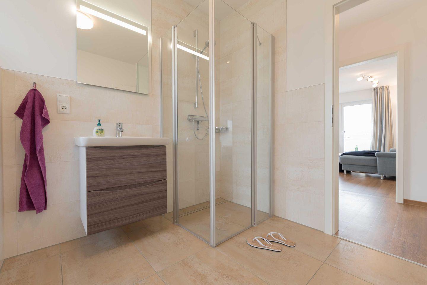 Das ca. 8 qm messende Bad ist mit einer geräumigen Dusche, einer Waschmaschine