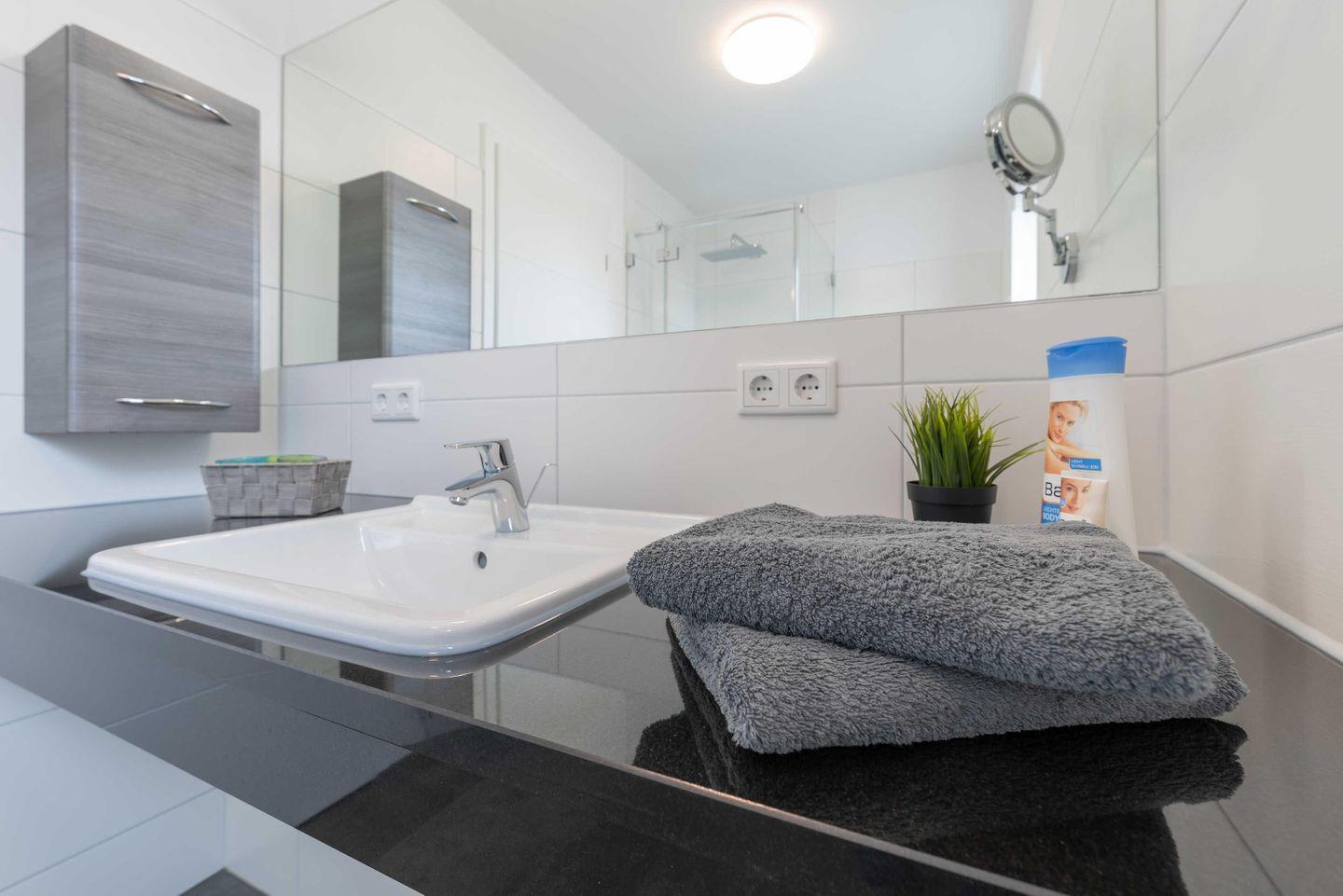 und ebenfalls ein Kleiderschrank. Das Bad ist mit einer bodengleichen Dusche und