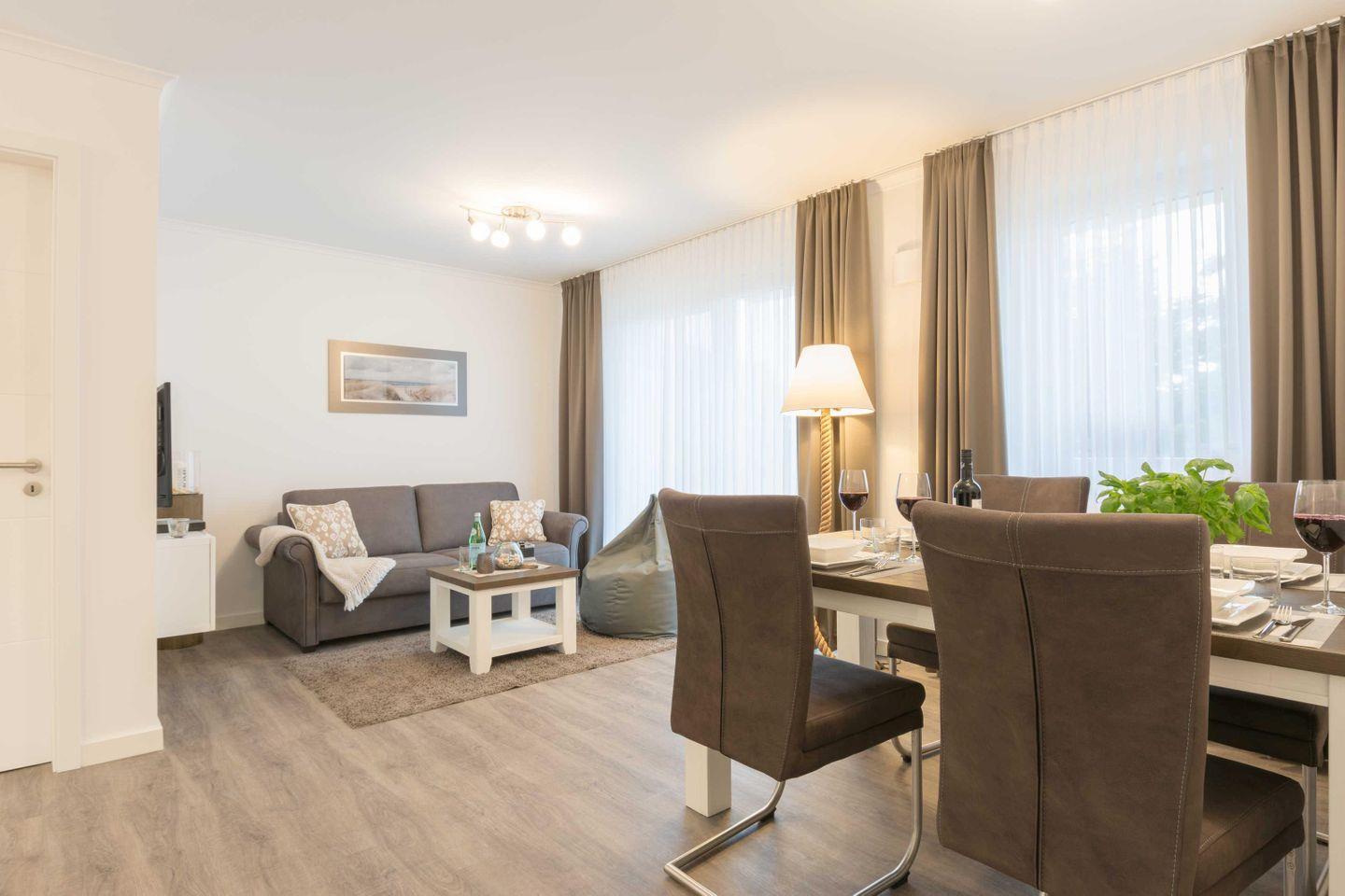 Die hochwertige Einbauküche verfügt über Kaffeemaschine, Toaster, Wasserkocher, Kühlschrank, inklusive Tiefkühlfach, Geschirrspüler und Cerankochfeld mit vier Platten. Der große Esstisch mit vier bequemen Stühlen ermöglicht gemütliches Essen und ist auch bestens geeignet für gesellige Spieleabende.
