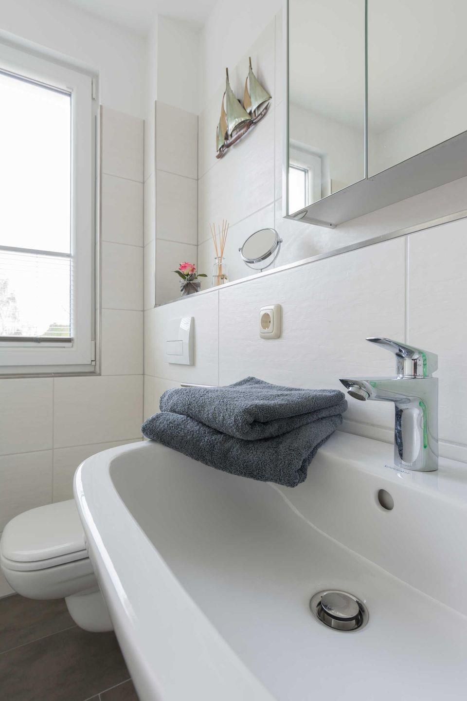 Es gibt zudem einen Föhn, einen Kosmetikspiegel und einen Wäscheständer.