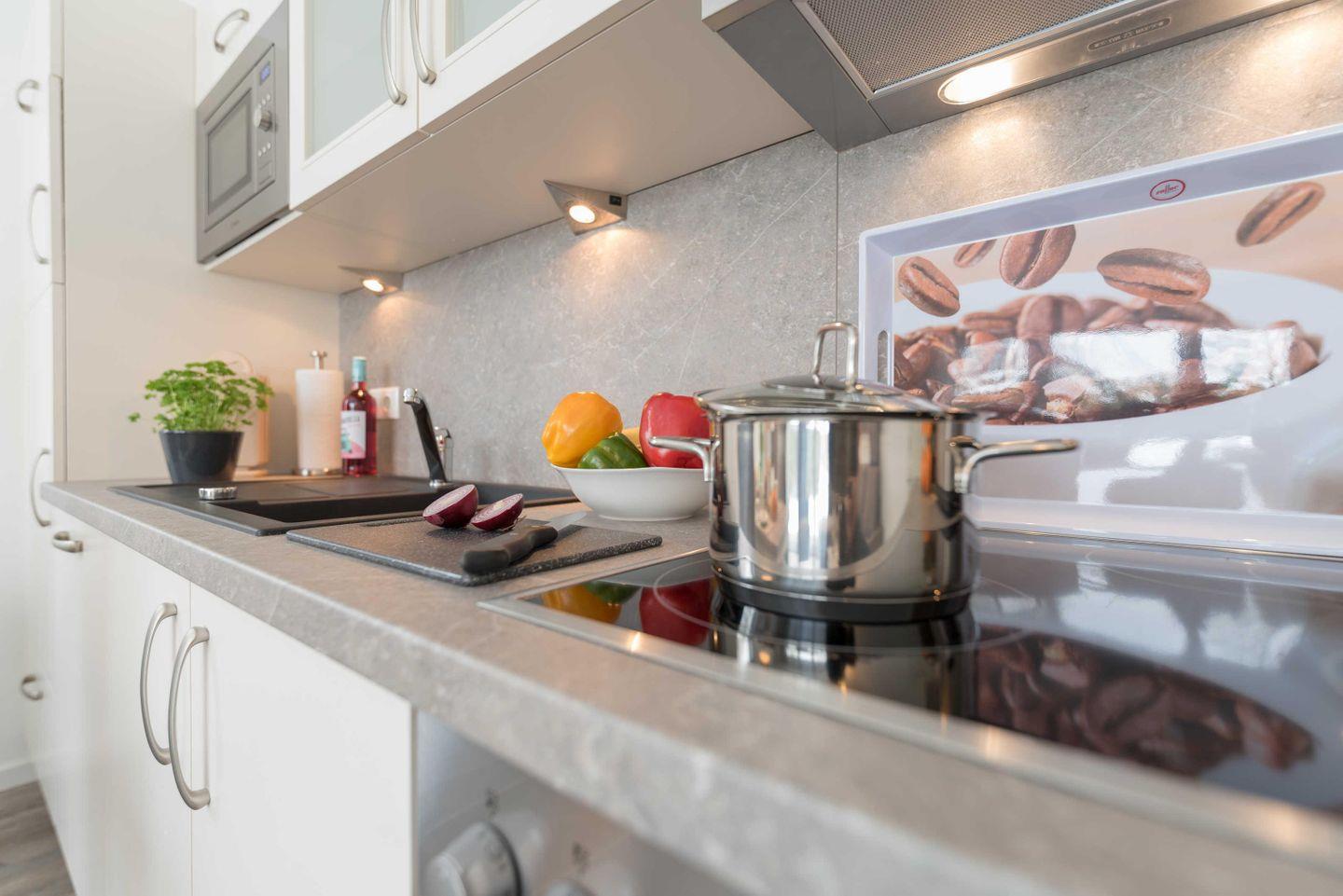 Kühl- und Gefrierschrank, einen Backofen, ein Cerankochfeld, eine Mikrowelle,
