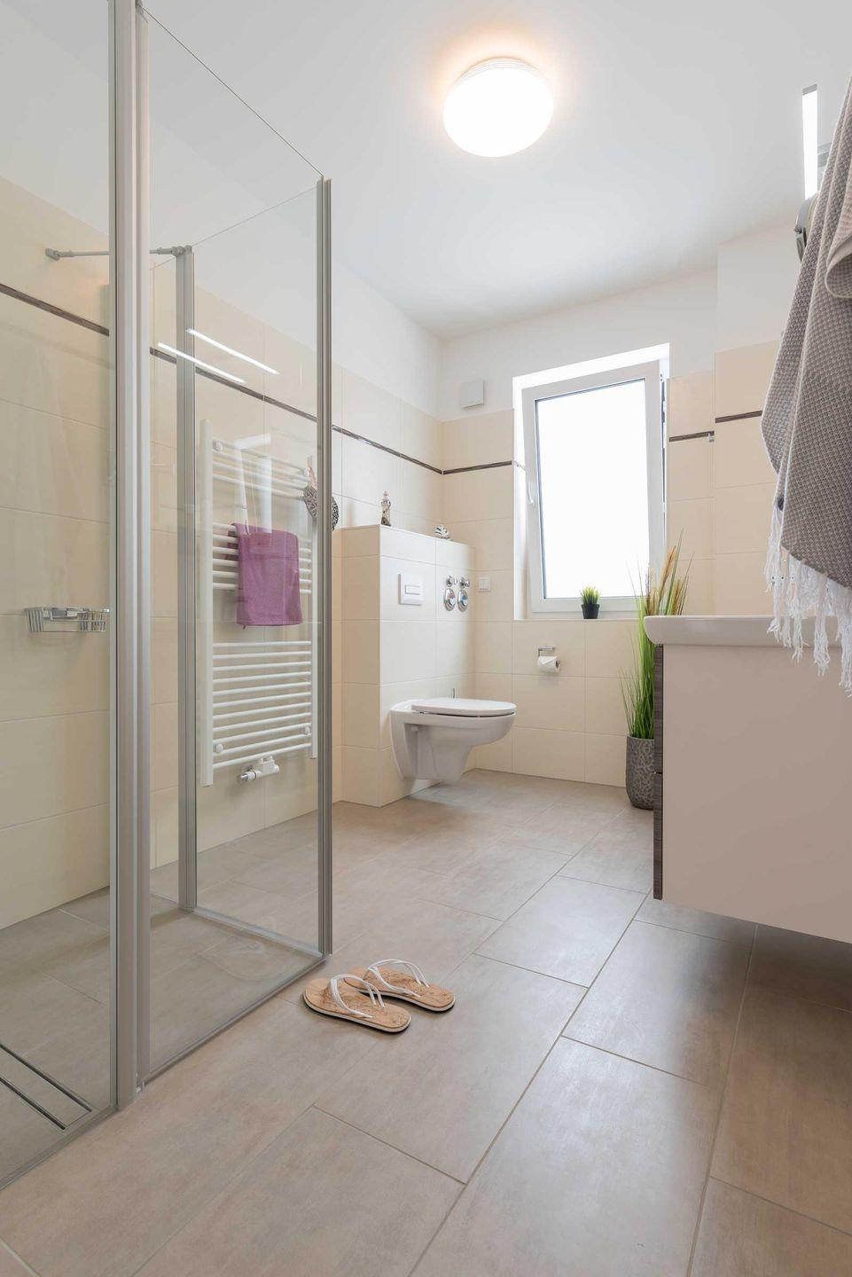 Das helle Badezimmer mit Fenster und bodengleicher Dusche verfügt über einen