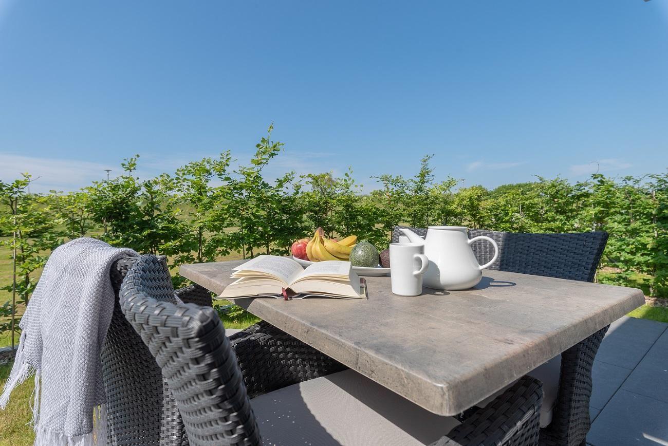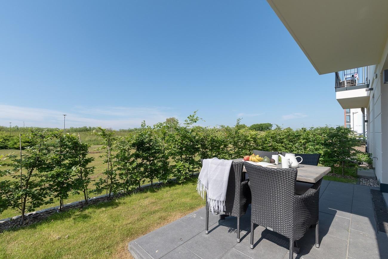 Die Terrasse bietet, für ein entsprechendes Urlaubsfeeling, einen herrlichen Blick auf die Dünen vor dem Meer. Unterstützt wird das Ganze durch das Meeresrauschen der Ostsee. Für erholsame Stunden können Sie hier vier Rattan Stühle und einen Tisch zum Lesen und Entspannen nutzen.
