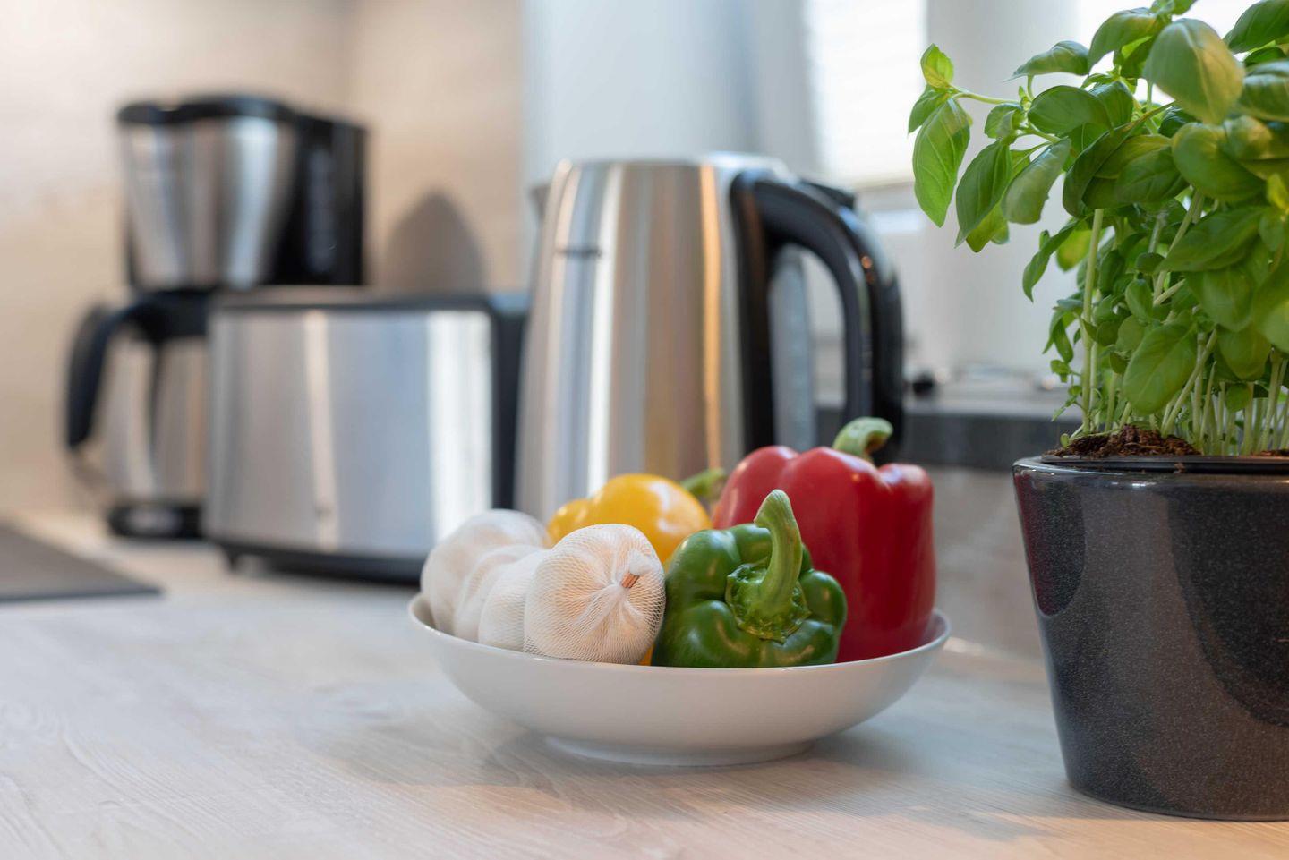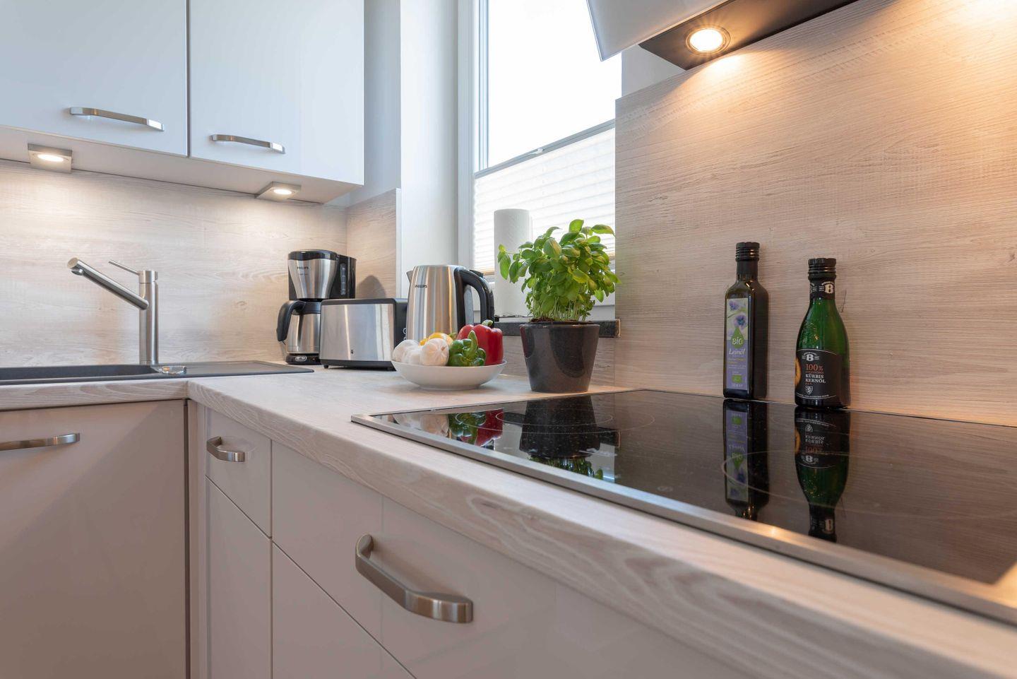 Im offenen Kochbereich stehen Ihnen in einer gut ausgestatteten Einbauküche mit Geschirrspüler, Kühlschrank, inklusive Gefrierfach, Mikrowelle mit integriertem Backofen, eine Kochstelle (Ceranfeld), Kaffeemaschine, Wasserkocher und Toaster zur Verfügung. Das Schlafzimmer bietet Ihnen ein großes Doppelbett, einen Kleiderschrank mit viel Stauraum und einen Flatscreen-TV.