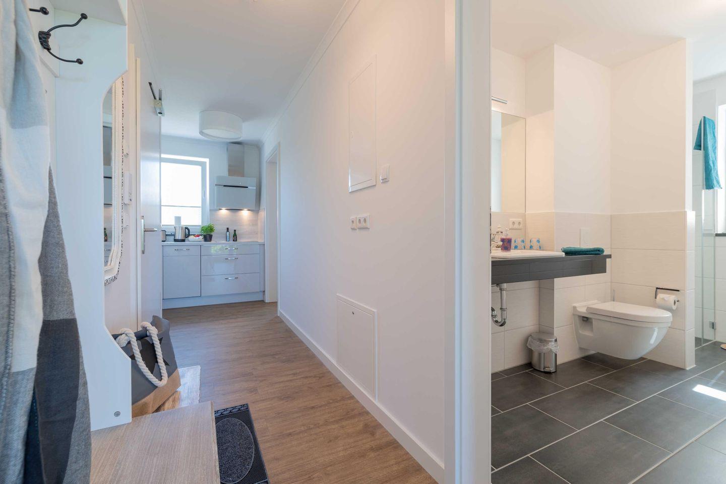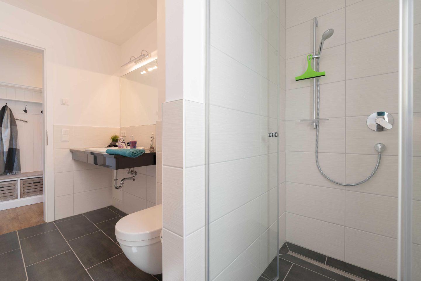 Das elegante Duschbad mit einer bodengleichen Dusche, einem großzügigen Waschtisch und Föhn, sorgen für Ihr Wohlbefinden.