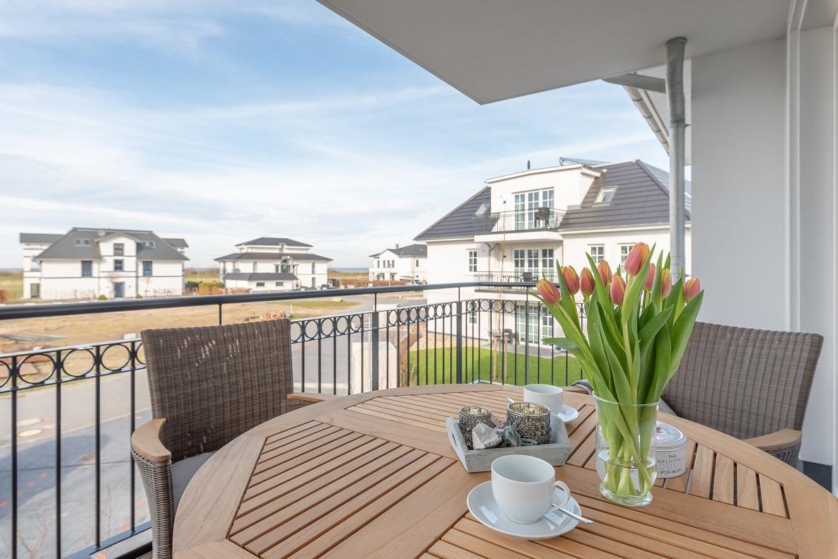 Drei-Zimmer-Ferienwohnung im ersten Obergeschoss mit weitem Meerblick vom Balkon