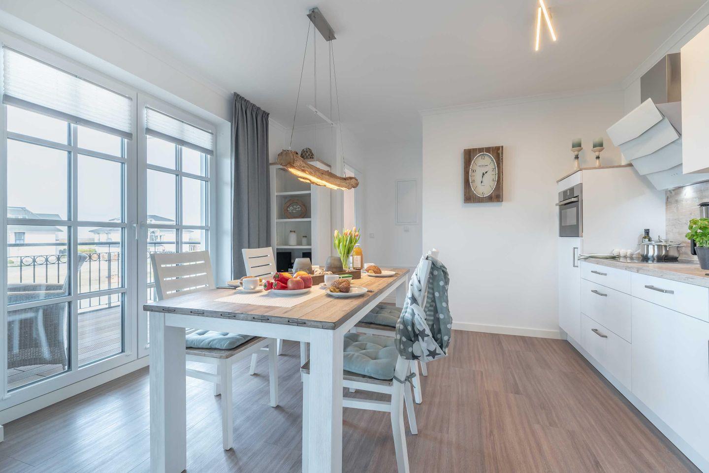 Zugang zum großzügigen Balkon mit Tisch und vier Stühlen. Von hier aus können