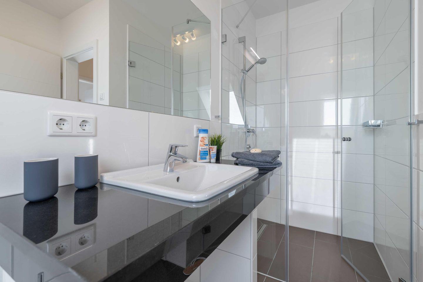 eine ebenerdige Dusche und ein Waschbecken mit großem Spiegel. Die sich in der