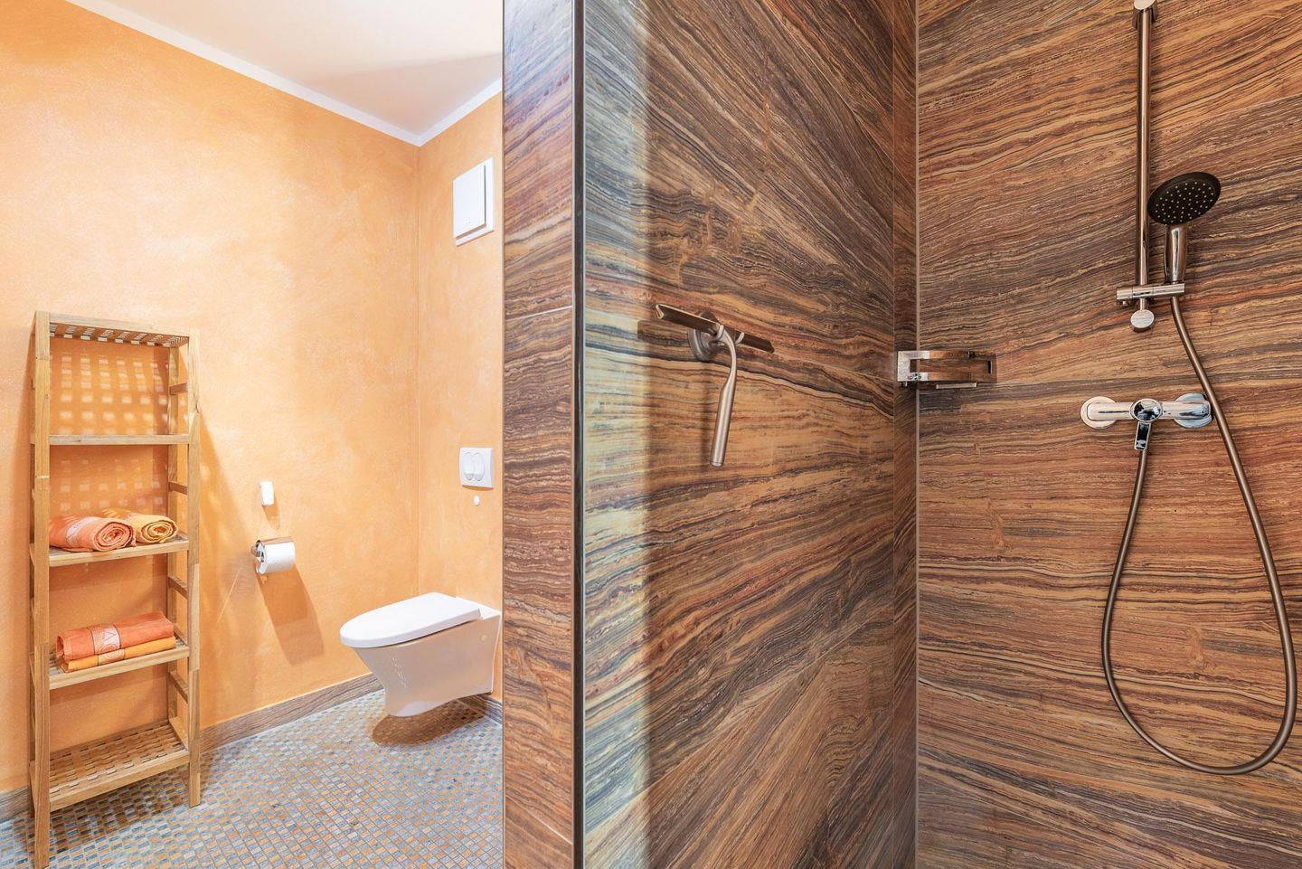 Kleiderschrank in warmen Erdtönen. Highlight des Badezimmers ist die geräumige