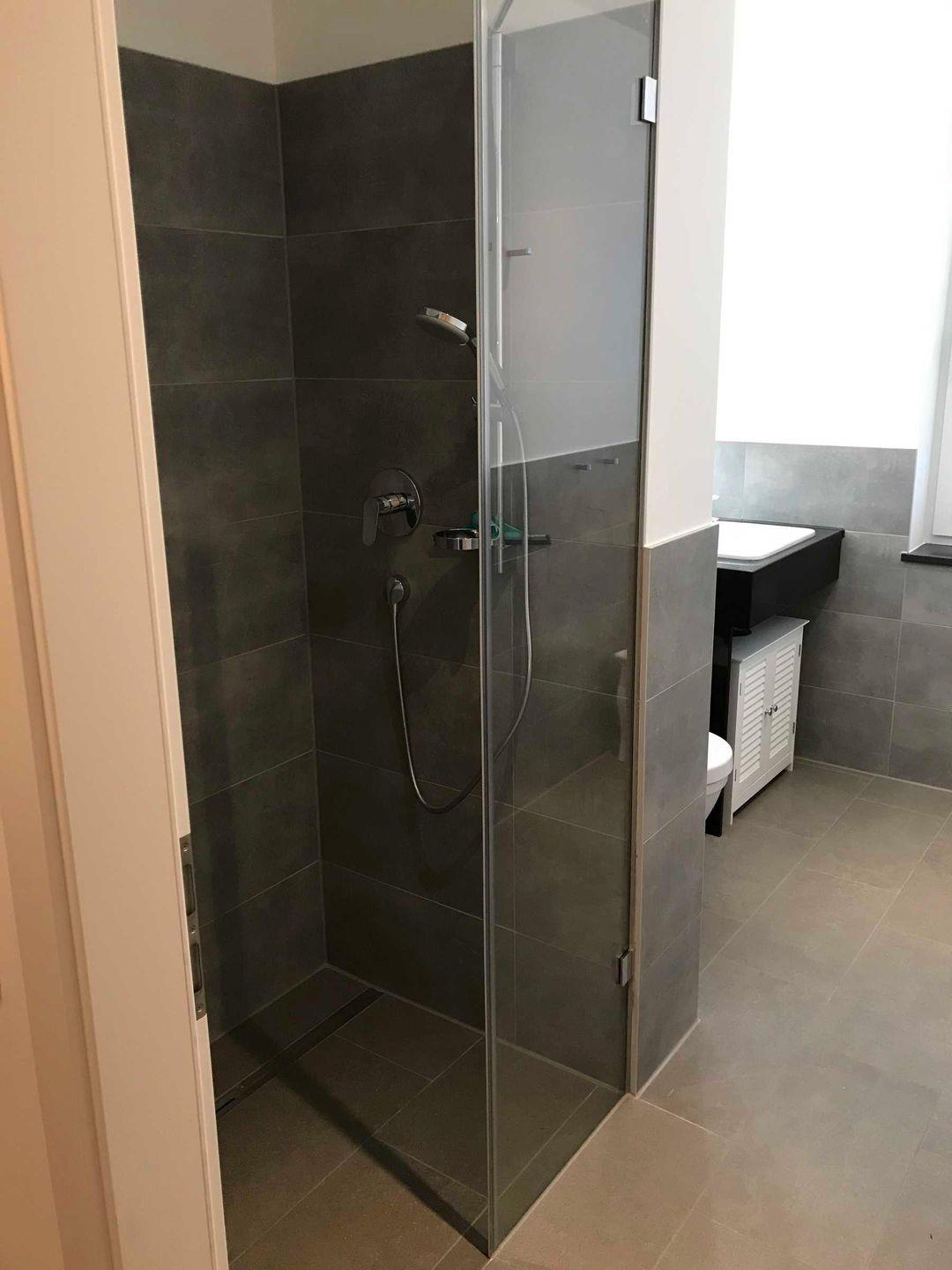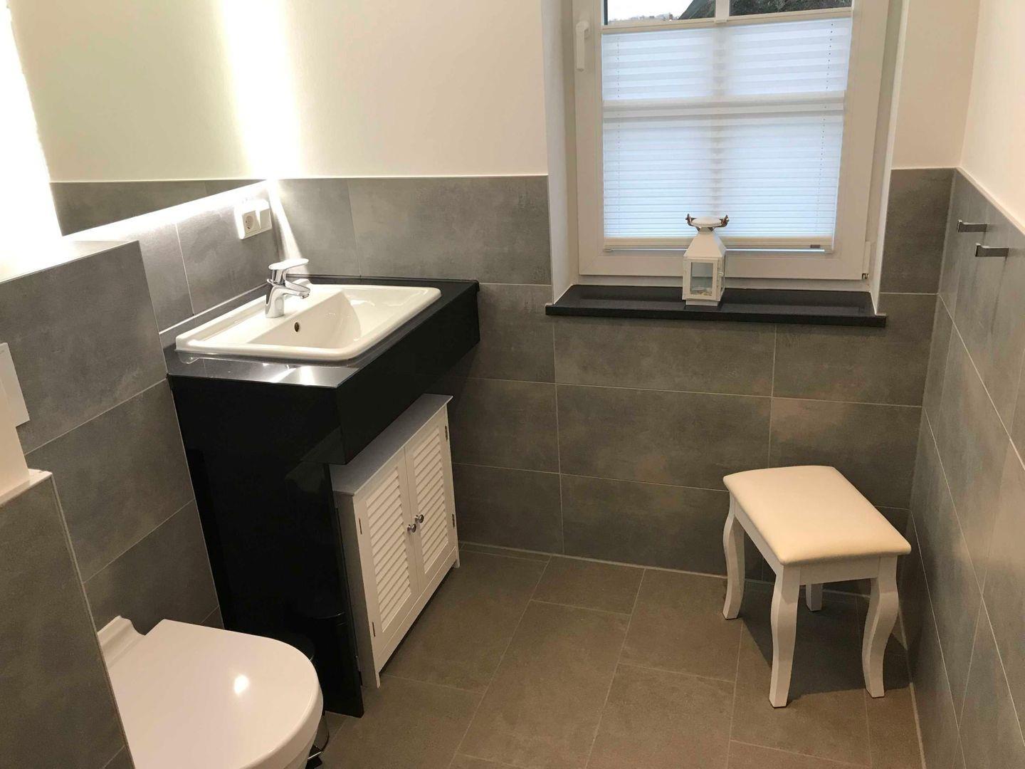 Das helle Badezimmer mit bodengleicher Dusche verfügt über einen Waschtisch, ein