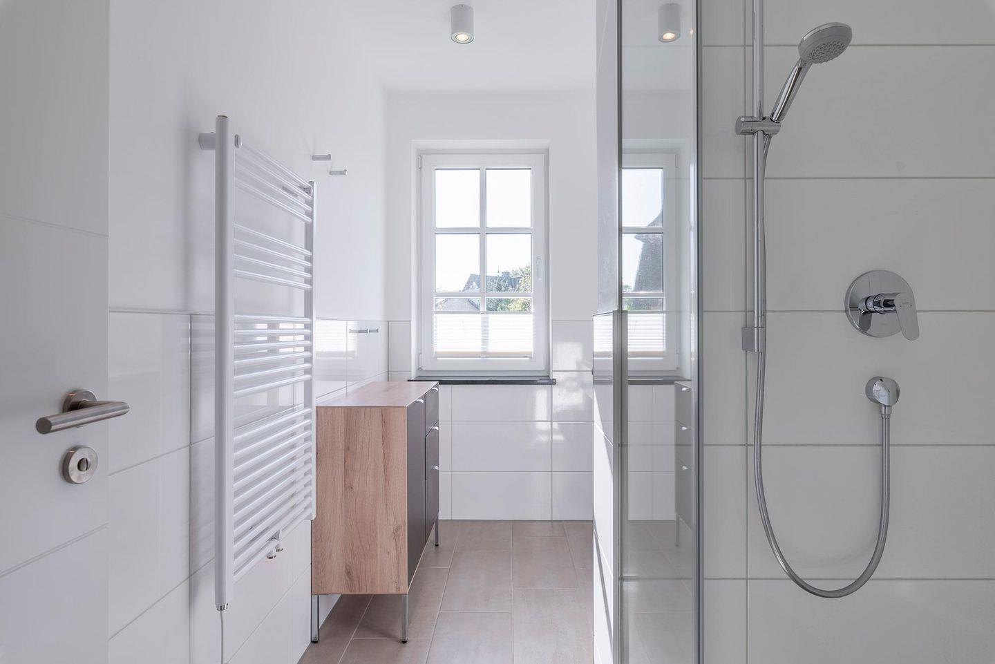 fünfte Person. Das Bad verfügt über eine ebenerdige Dusche, einen Waschtisch mit