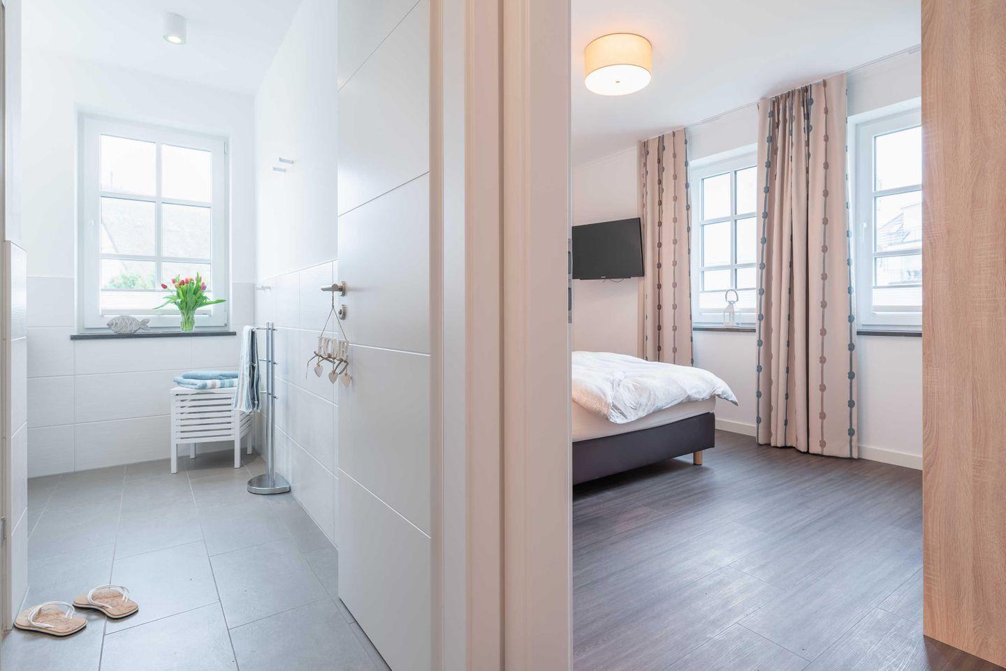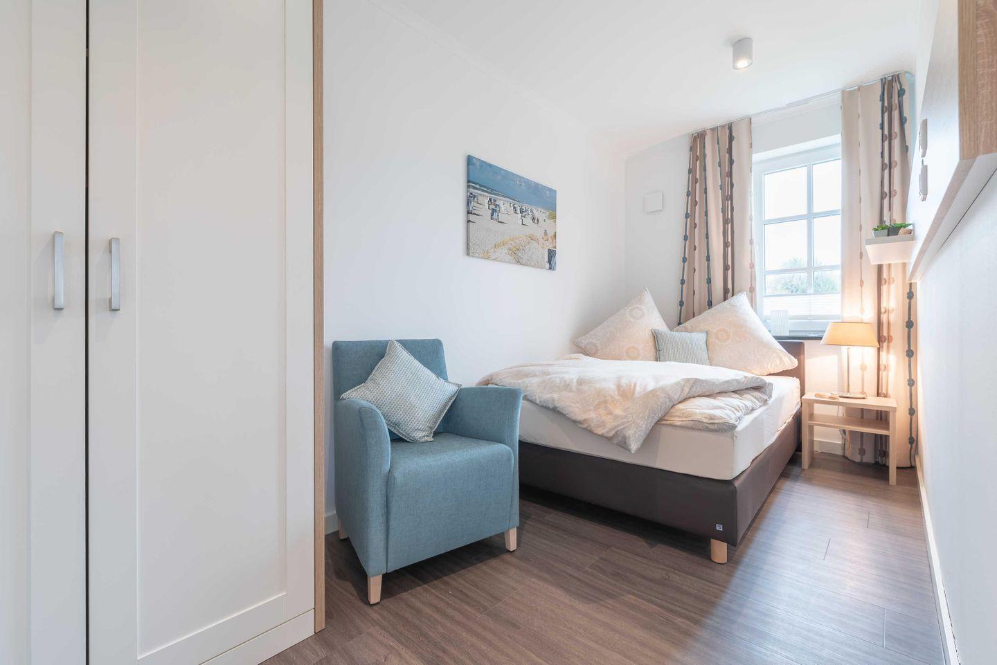 ein Flachbild-TV. Das kleinere Schlafzimmer verfügt über ein Boxspringbett 1,40