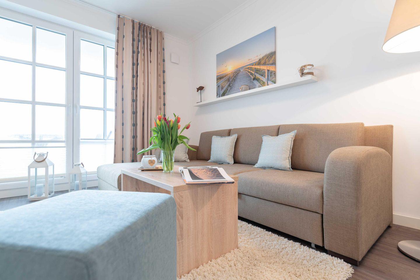 Flachbild-TV, Stereo-Anlage und Blu-ray-Player sind vorhanden. Die gemütliche