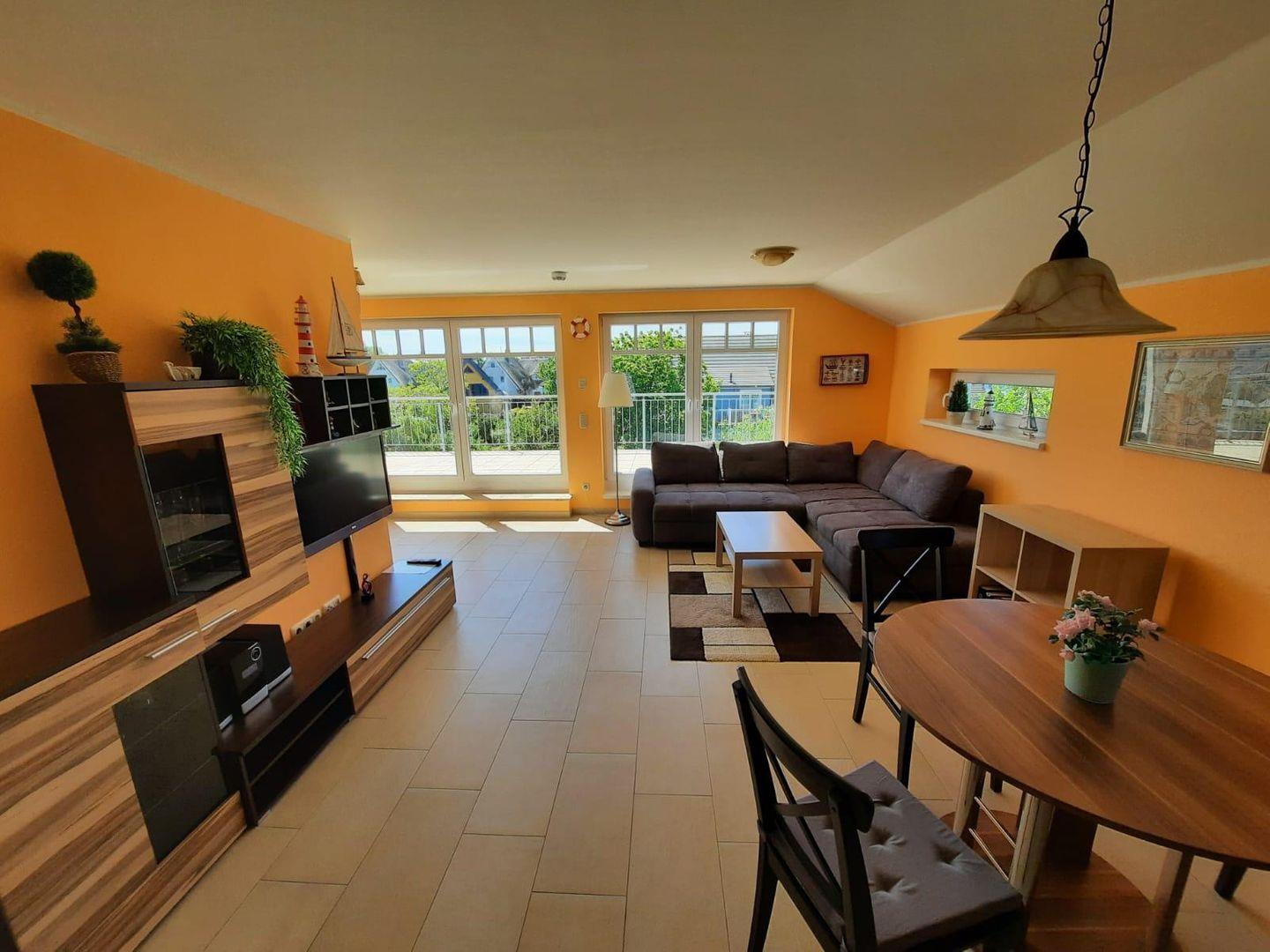 Die Wohnung wurde liebevoll im gemütlichen WOHNBEREICH mit einer großen Sitzlandschaft und Flachbildfernseher ausgestattet. In der OFFENEN KÜCHE erwarten Sie ein Essbereich, Geschirrspüler, Mikrowelle, Kaffeemaschine, Kühlschrank, Toaster und ein Wasserkocher. Also alles, was zur Zubereitung einer vollwertigen Mahlzeit benötigt wird. Somit bleibt hier keine Wunsch offen.