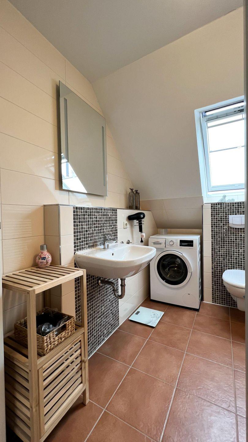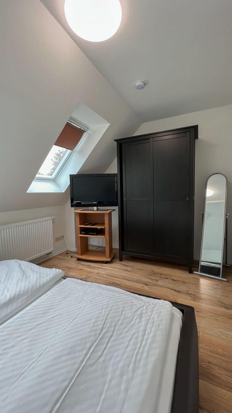 Die hochwertige offene Küche grenzt unmittelbar an den großzügigen Wohnbereich, der einen Essplatz und eine Leseecke unter dem Dachfenster bietet. Das Schlafzimmer ist mit einem komfortablen Doppelbett ausgestattet. Die Böden sind mit Laminat versehen, während der Rest der Wohnung gefliest ist. Ein modernes Tageslichtbad mit Waschmaschine und Regendusche rundet das Gesamtbild ab.