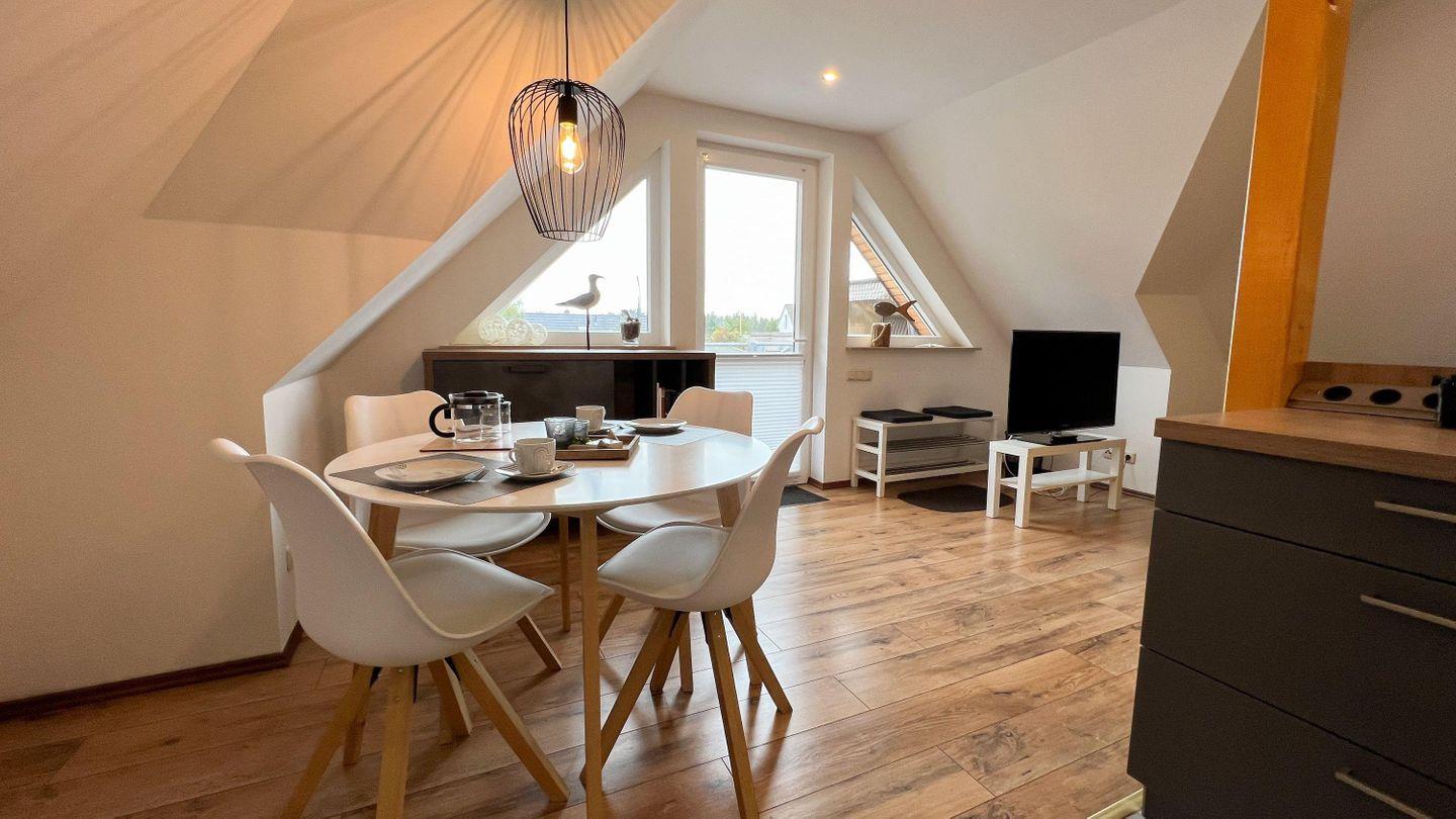 Die Ferienwohnung Sandkorn wurde 2020 komplett renoviert und bietet in Bezug auf Ausstattung und Komfort eine vergleichbare Qualität wie ihr "großer Bruder" Findling im Erdgeschoss. Sandkorn befindet sich im Dachgeschoss und ist über eine moderne Außentreppe erreichbar. Bei Ankunft gelangen Sie zunächst auf eine großzügige Dachterrasse, die mit einem gemütlichen Strandkorb zum Sonnenbaden und Verweilen einlädt. Von hier aus haben Sie sogar eine Aussicht auf den Conventer See in der Ferne.