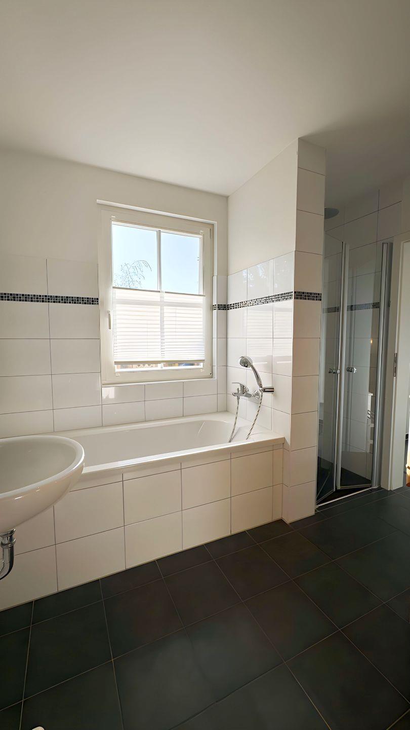das weitläufige Bad mit Badewanne, Dusche und eigener Sauna.