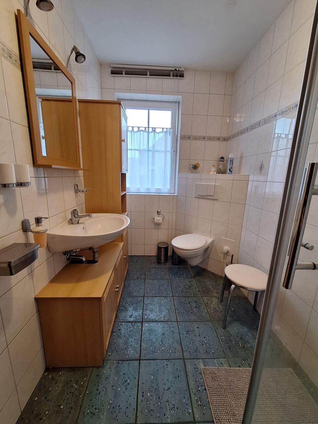 Das Badezimmer lässt keine Wünsche offen. Ausgestattet mit Fußbodenheizung, Dusche, WC, Waschbecken, Handtuchtrockner und viel Stauraum bietet es Komfort und Gemütlichkeit.