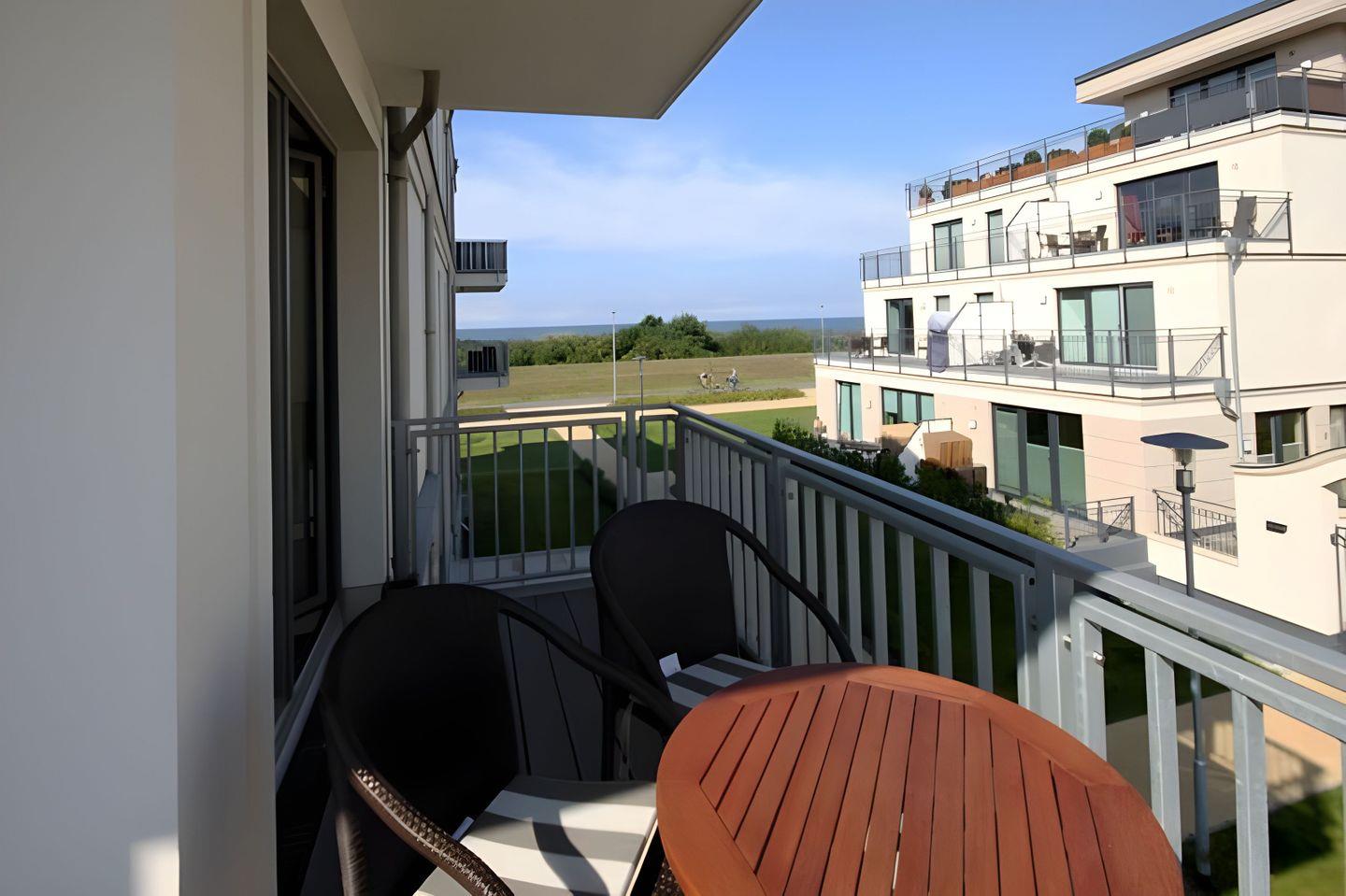 Die schöne, hochwertig eingerichtete Ferienwohnung liegt im ersten Obergeschoss der Villa Deichgraf. Hier finden vier Personen viel Platz, um sich wohlzufühlen. Vom großen Süd-Ost-BALKON blicken Sie auf das Meer. Die Ostsee selbst ist nur wenige Schritte entfernt. Genießen Sie beim Einschlafen und Aufwachen das Rauschen des Meeres in den beiden mit großem Doppelbett, geräumigem Kleiderschrank und Smart-TV eingerichteten SCHLAFZIMMERN. Für die Zubereitung von Mahlzeiten steht eine gut ausgestattete Einbauküche bereit. Neben den Standardgeräten finden Sie dort eine Mikrowelle, Backofen, Geschirrspüler und Kühlschrank mit Gefrierfach. Im Essbereich erwartet Sie ein großer Tisch mit vier bequemen Stühlen.
