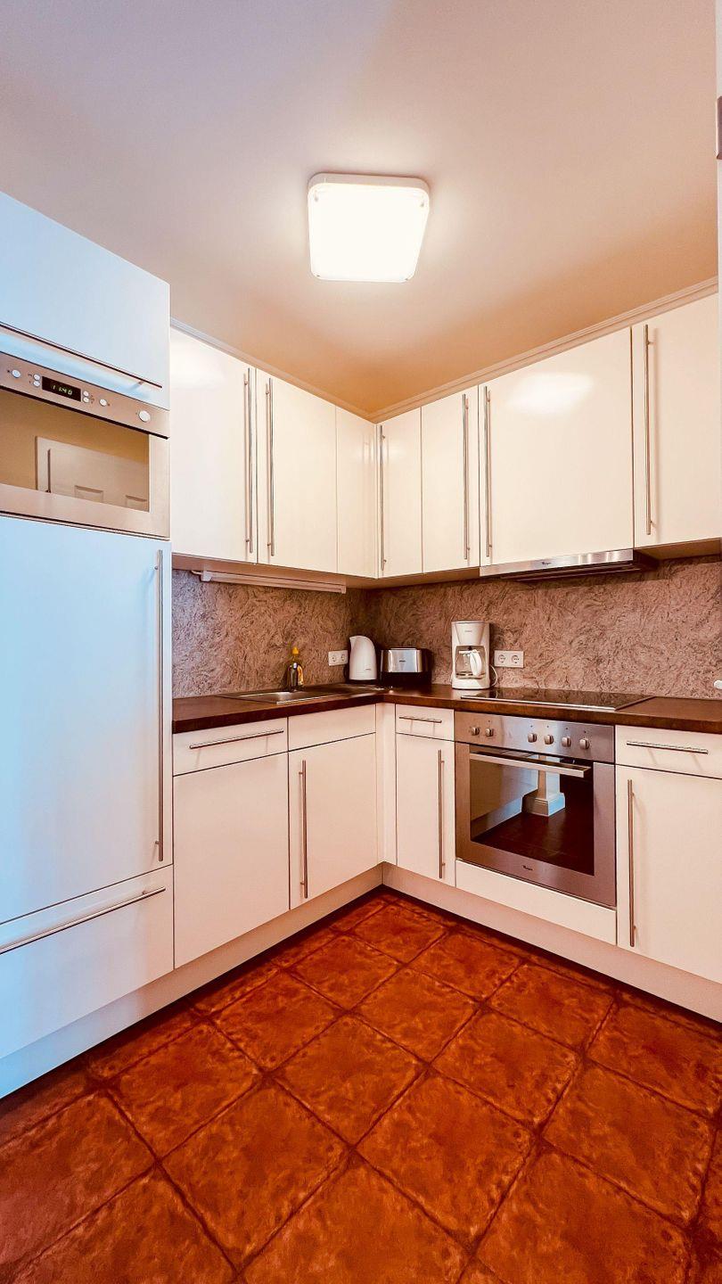 Der kombinierte WOHN-/ ESSBEREICH besticht mit einer gemütlichen Leder-Schlafcouch und einem stimmungsvollen Gas- Kamin. Ein großzügiger Esstisch mit Stühlen lädt zu gemeinsamen Mahlzeiten und Spieleabenden ein. Für die mediale Unterhaltung stehen ein TV- Gerät und ein Radio für Sie bereit. In der offenen EINBAUKÜCHE haben Sie alles, was zum Zubereiten von vollwertigen Mahlzeiten notwendig ist. Einen Geschirrspüler, Kühlschrank, inklusive Gefrierfach, Kaffeemaschine, Wasserkocher, Toaster, Mikrowelle und diverse Kochgeräte.